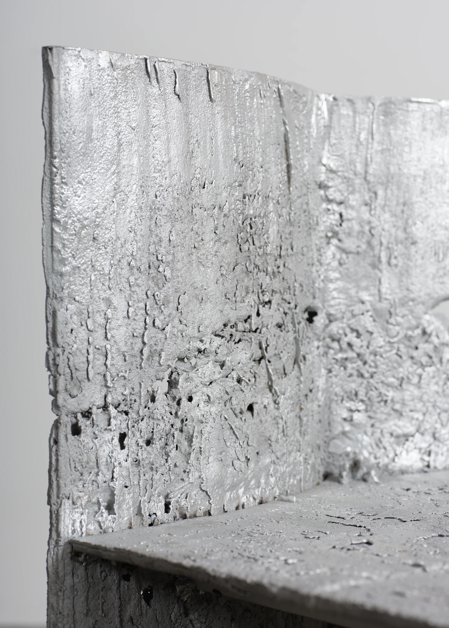 Le processus de fabrication de cette chaise est indissociable de sa signification. Des blocs de bois récupérés d’arbres épargnés par le feu mais abattus par le vent sont sculptés en formes sobres, presque mémorielles. Ces cavités agissent comme des architectures éphémères, contenant de l’aluminium en fusion suffisamment longtemps pour que l’incertitude y laisse son empreinte.