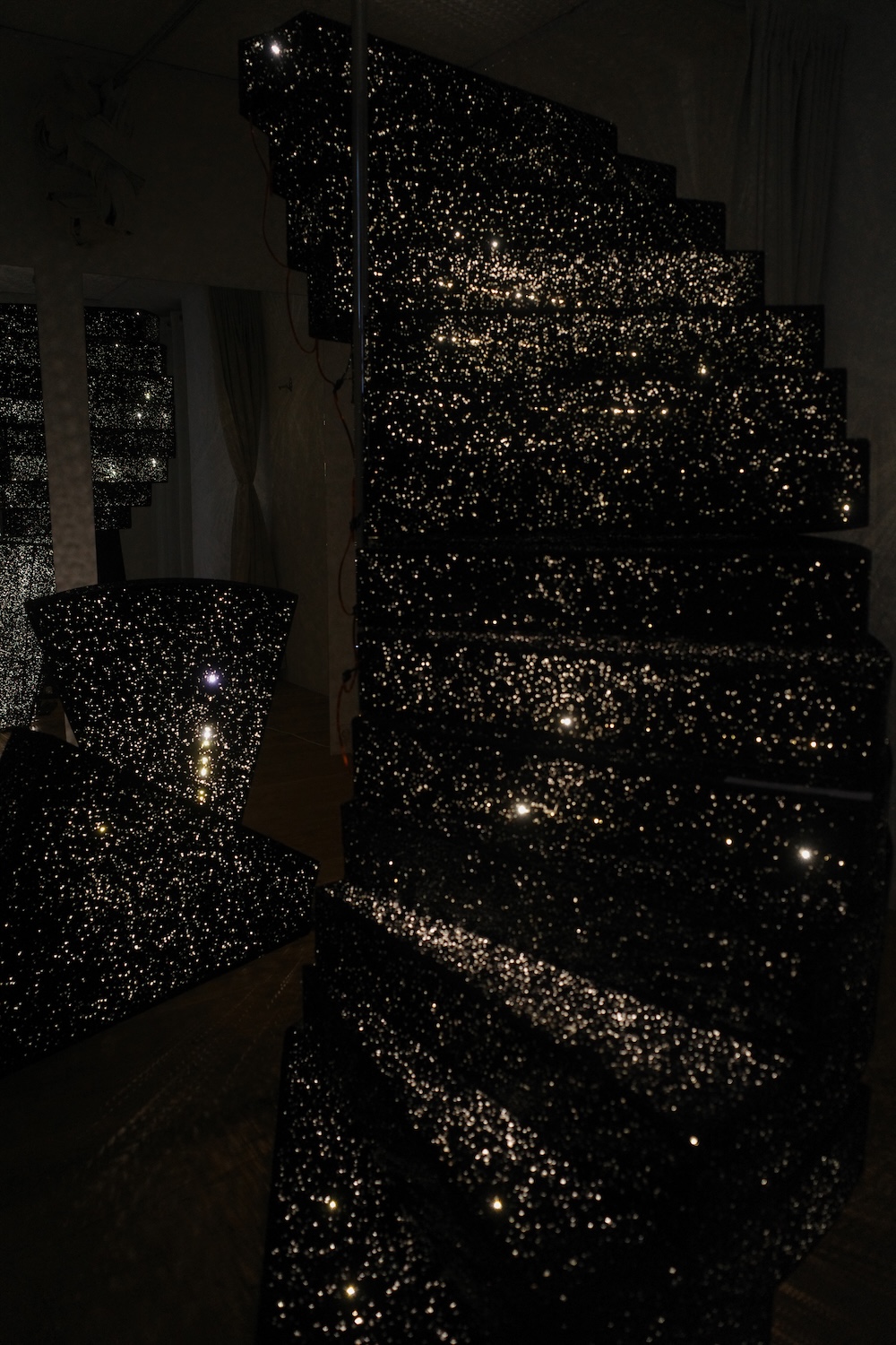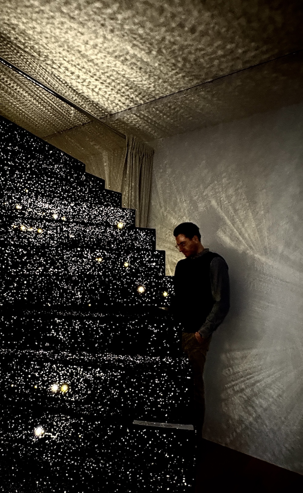 Au cœur de l’exposition, l’installation Galaxy Staircase « Trace » de Vera Huang incarne cette pensée de l’espace ouvert. Archétype architectural de l’élévation, l’escalier est ici volontairement privé de sa fonction. Suspendu, impraticable, il flotte comme un corps céleste.