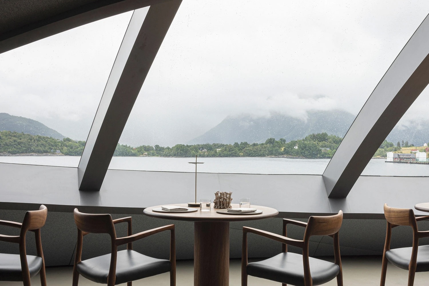 À travers les baies vitrées panoramiques, le spectacle extérieur offre un contraste constant. Des glaciers se détachent au loin. Des systèmes météorologiques traversent les montagnes. Des bateaux de pêche défilent dans le champ de vision, tels des décors d’un film au ralenti. La chaleur de l’intérieur se détache avec force sur ce fond d’immensité nordique, rendant le repas d’autant plus humain.