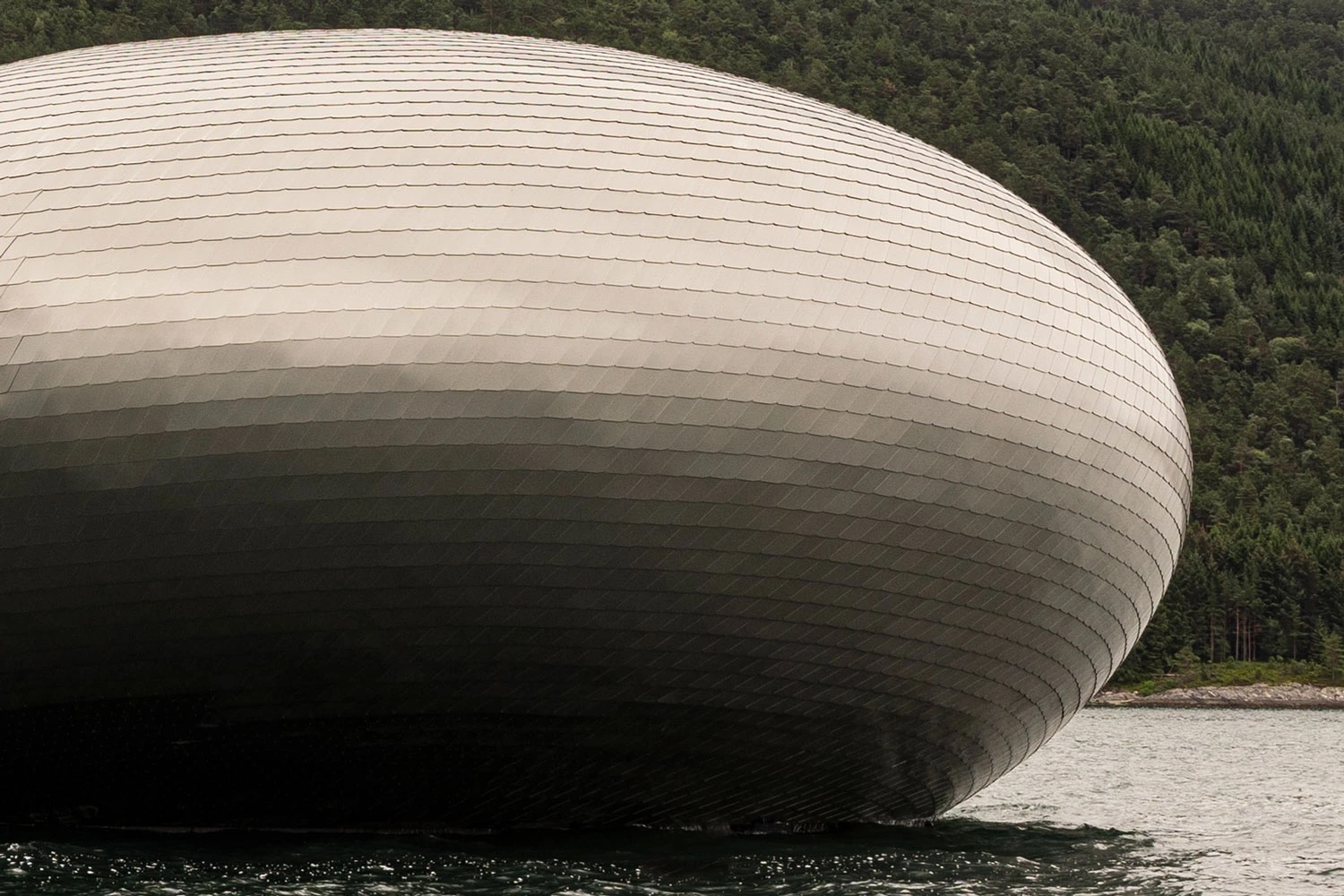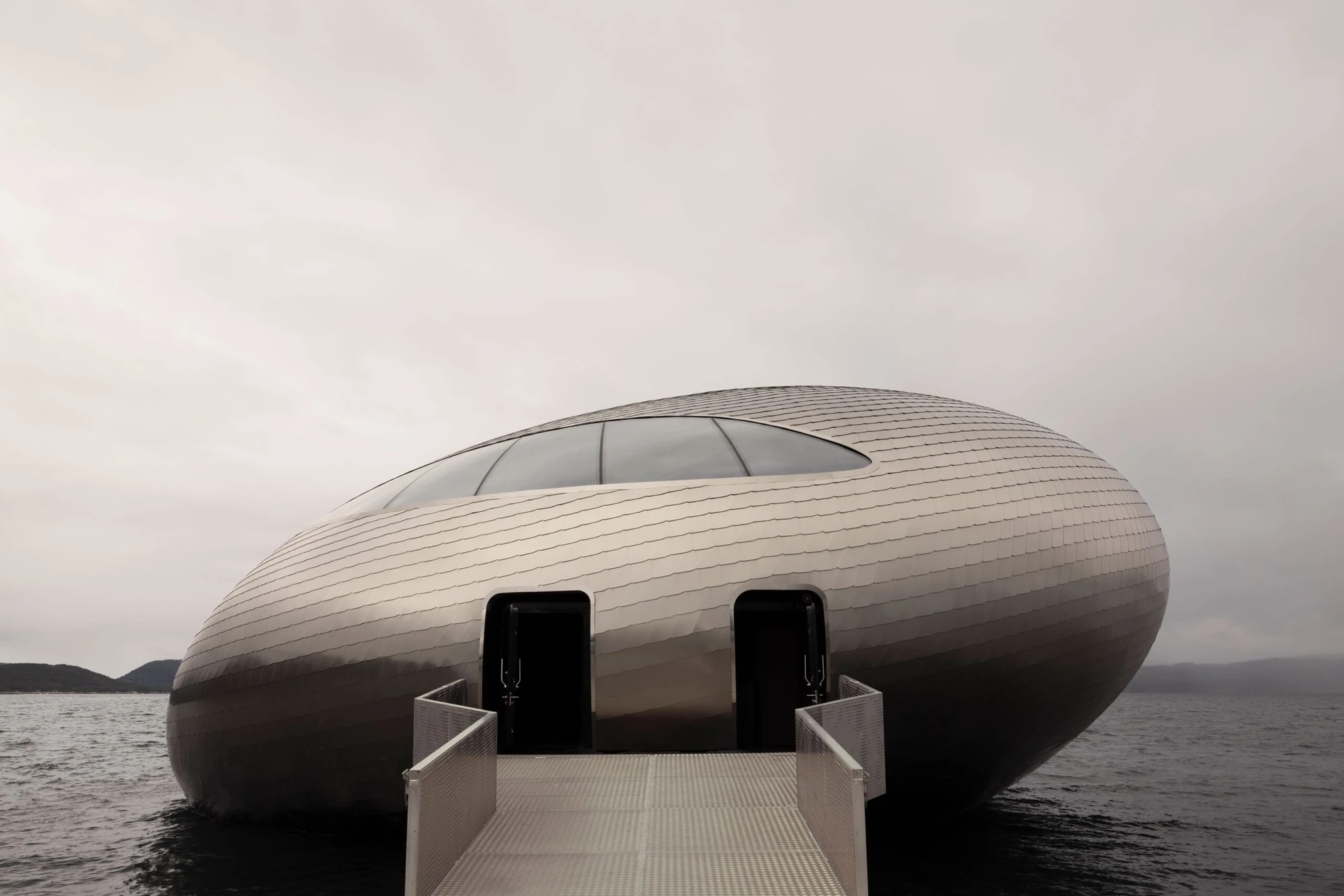 Le Hardangerfjord s’étend entre montagnes et glaciers dans l’ouest de la Norvège. Ses eaux abritent des élevages de saumon qui ont transformé l’économie régionale. Sur ce plan d’eau flotte le Salmon Eye – un ellipsoïde d’acier revêtu d’écailles imitant le poisson qu’il célèbre.