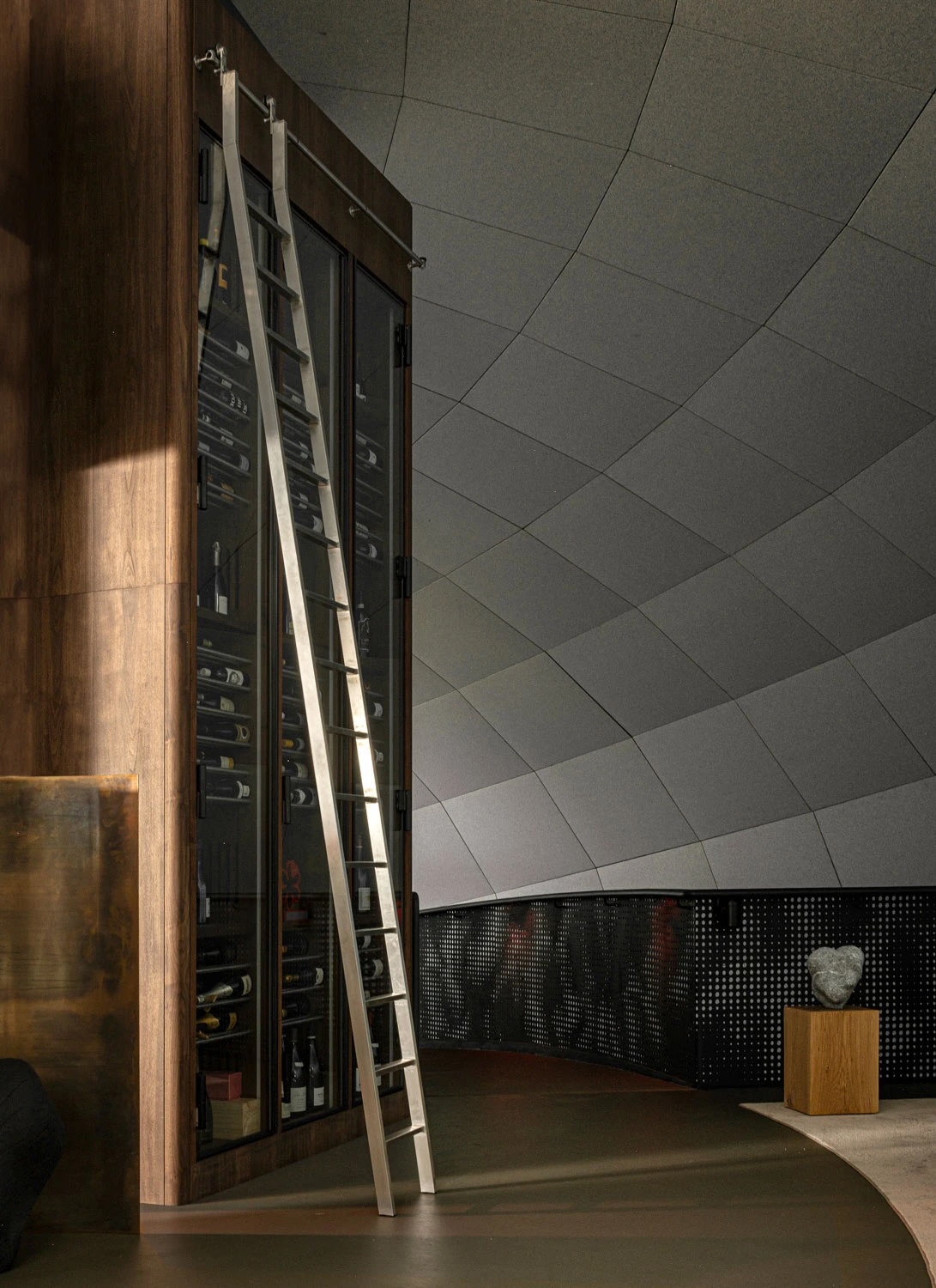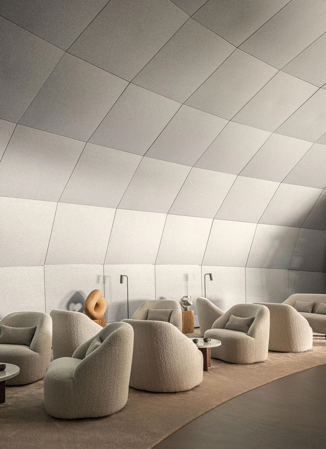 L’harmonieuse combinaison de mobilier sur mesure, d’un éclairage tamisé et de matériaux naturels crée une atmosphère intime et chaleureuse au cœur des courbes d’acier saisissantes du bâtiment.