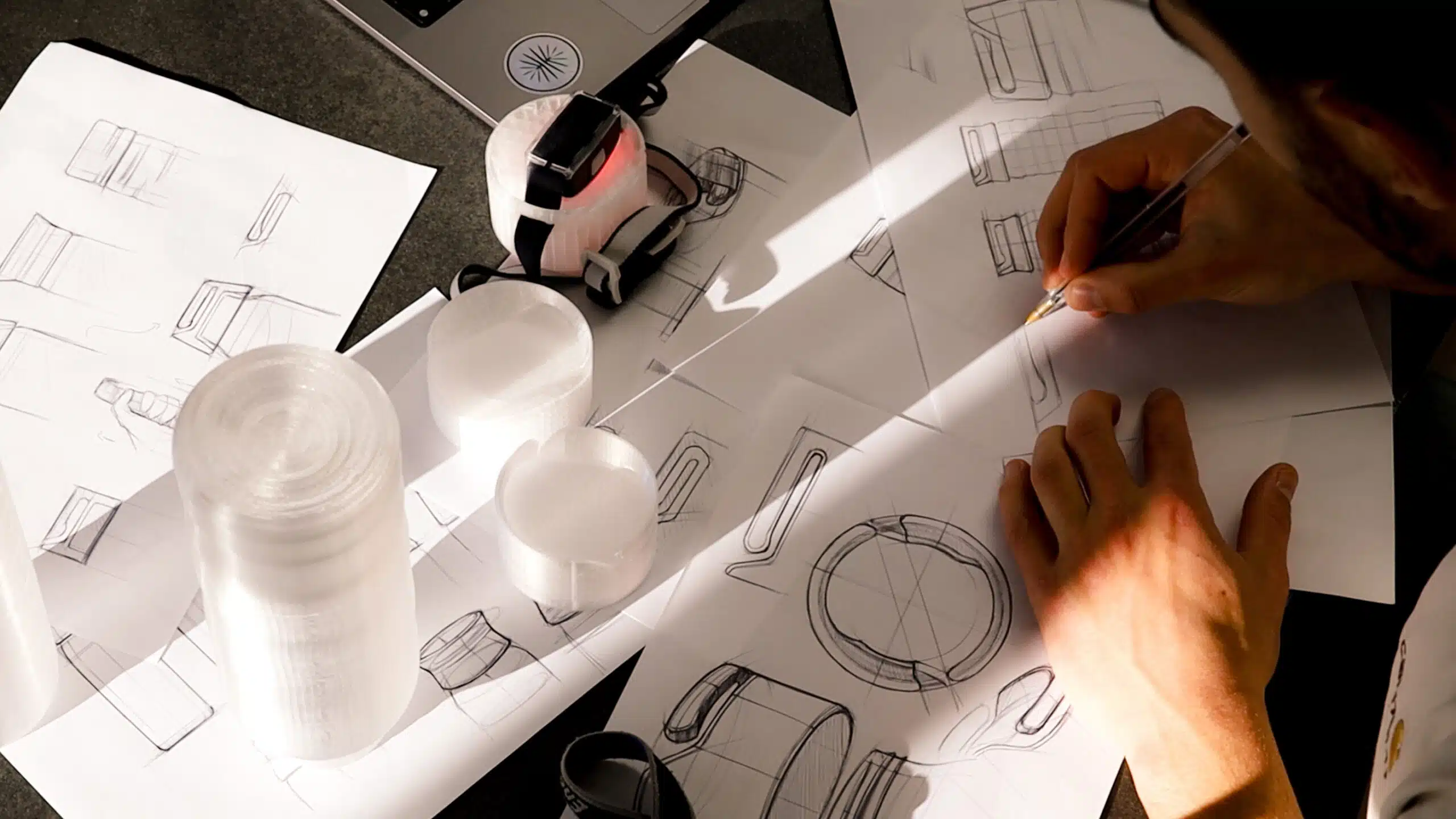 Le travail sur la forme de l’objet constitue un autre axe de recherche, où comment un objet technique outdoor peut-il communiquer simultanément sa fonction d’hydratation et sa capacité à devenir source lumineuse ? Où comment apporter de la fonction sans surcharger le marcheur en recherche d’économie de poids et gain de performance.