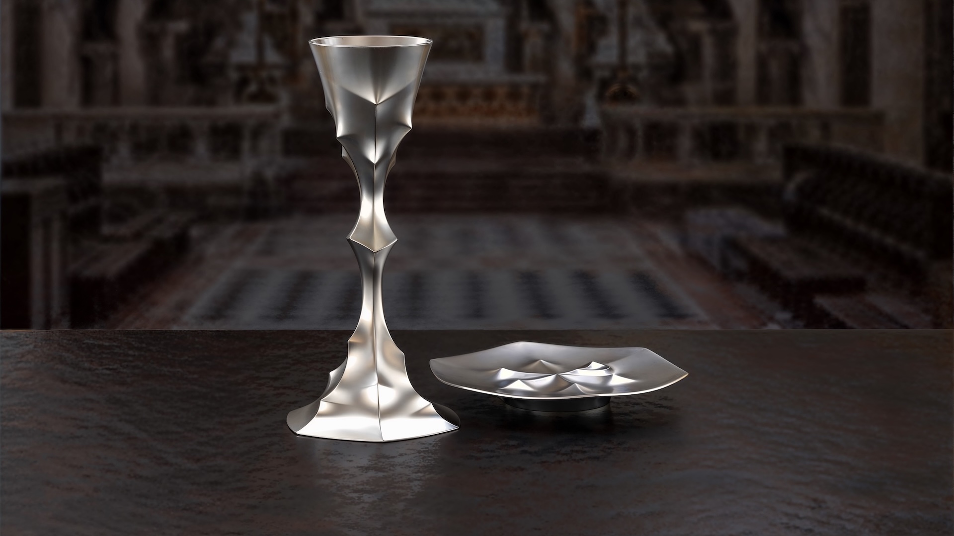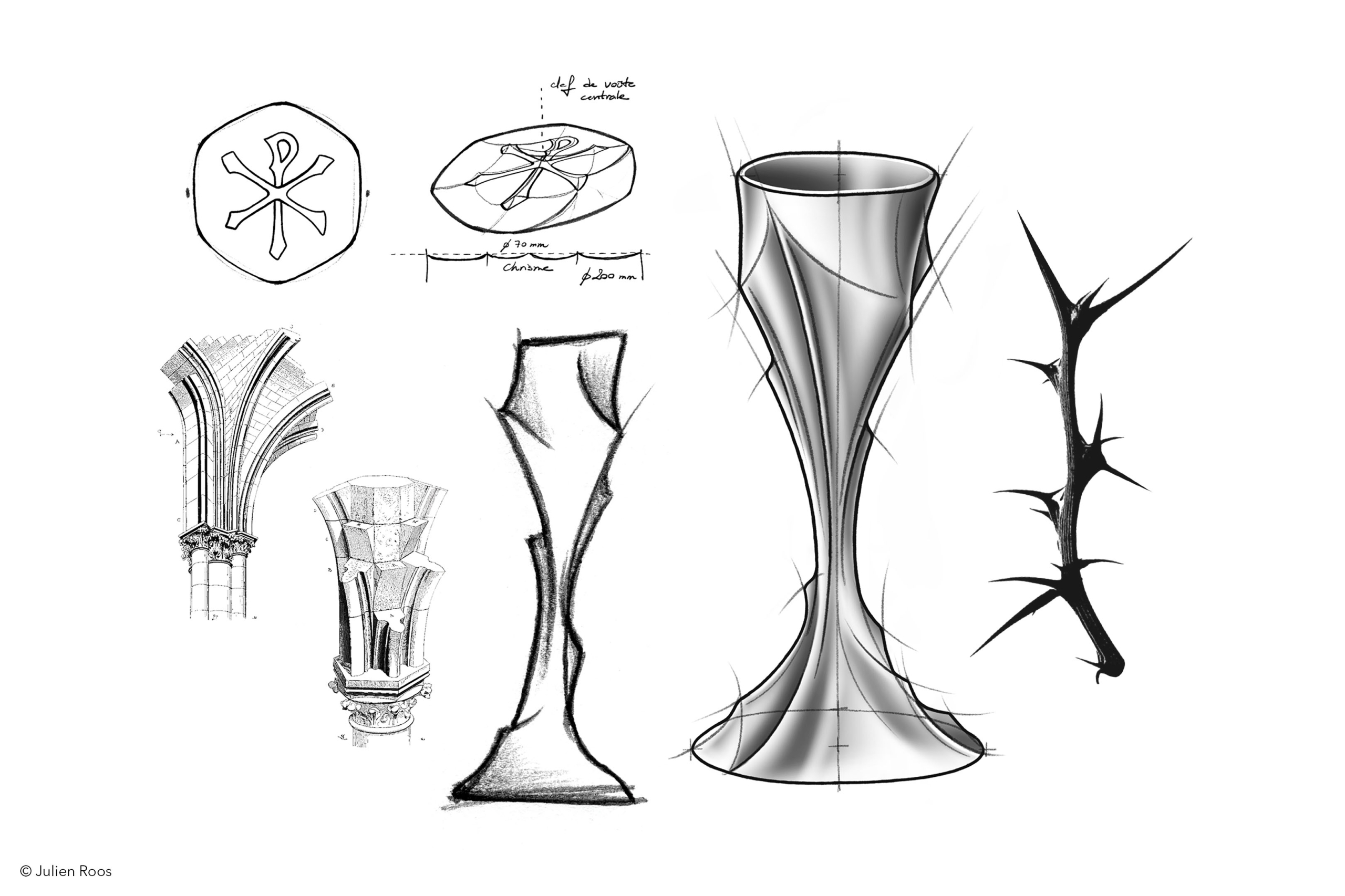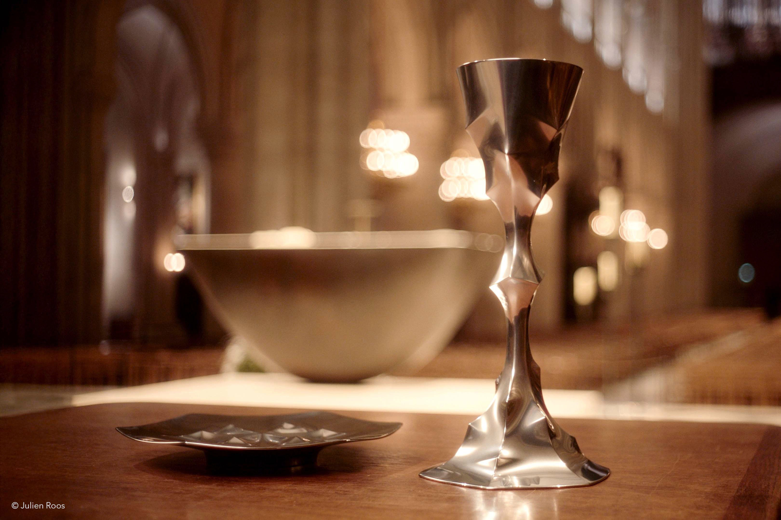 Le calice et la patène conçus par Julien Roos puisent leur inspiration dans plusieurs strates de sens. D’abord, la symbolique de l’Eucharistie, où ces objets deviennent les vecteurs matériels de la transsubstantiation, transmettant le souffle de vie du sacrifice et du partage. Ensuite, l’architecture gothique de Notre-Dame, avec ses lignes de forces, ses voûtes, ses arcs-boutants et ses courbes structurelles, ré-interprétées dans un dessin fluide et organique.