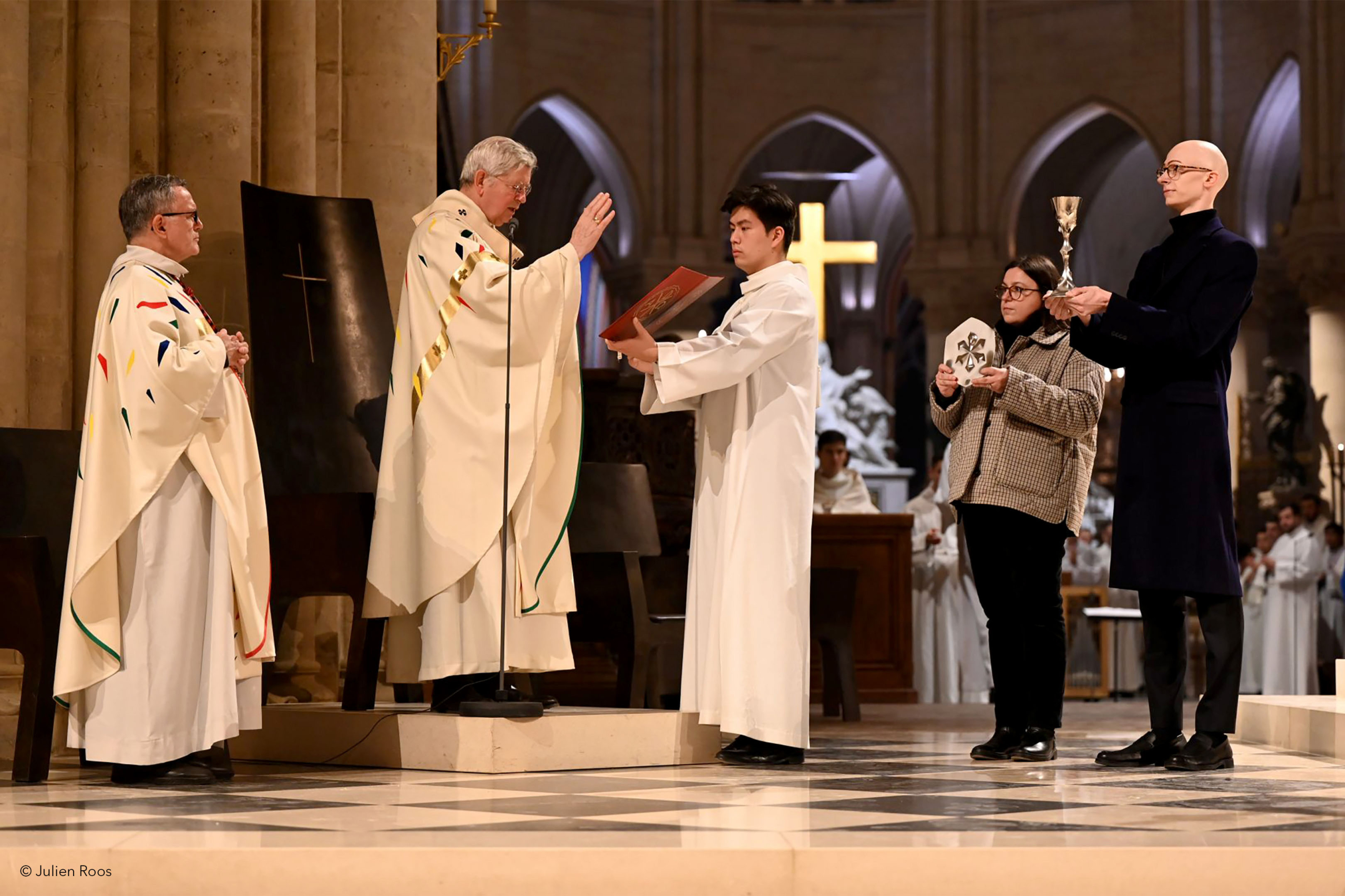 Fin 2023, à l’issue d’une visite du chantier de restauration de la cathédrale, le Père Emmanuel Boudet, doyen du Chapitre de Notre-Dame de Paris, confie à Julien Roos une commande exclusive : la création d’un calice et d’une patène destinés à l’exercice du culte et au Trésor de la cathédrale. Le projet s’inscrit dans un cadre à la fois symbolique, spirituel et patrimonial d’une rare intensité.