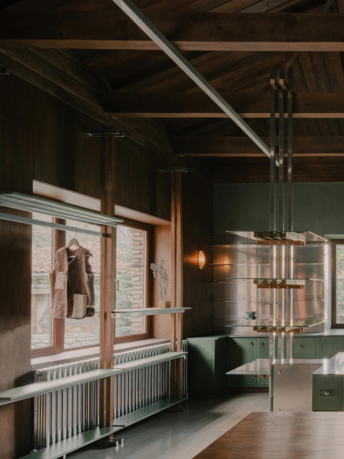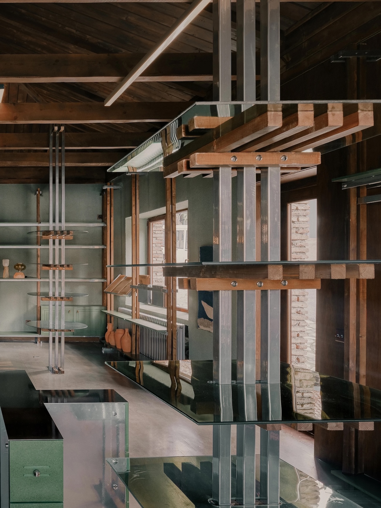 Le revêtement en agrégats de pierre des surfaces non vitrées renforce l’atmosphère aquatique. Le gravier gris-vert, incrusté dans le plâtre, évoque des sédiments lacustres ramenés à l’intérieur. Des sections de pierre locale apparente rompent cette texture, leur présence plus brute ancrant la palette autrement éthérée. Le sol poursuit cette logique minérale, sa surface rappelant des eaux peu profondes asséchées.