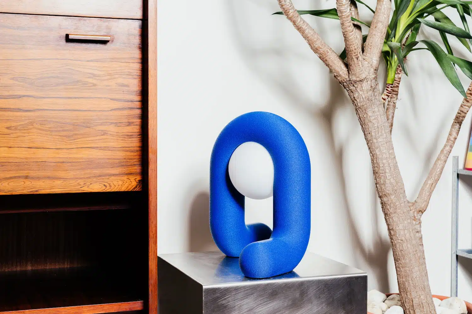 La Dancer est imprimée en 3D en trois parties distinctes, ce choix, à la fois conceptuel et technique, permet au globe en verre de se trouver au cœur de l’objet tout en restant entièrement remplaçable. Grâce à un prototypage poussé, un système d’emboîtement sur mesure a été développé et imprimé directement dans les pièces. Une fois assemblées, les pièces s’emboîtent parfaitement, sans colle ni vis, rendant la jonction quasiment invisible. Cette approche rappelle les réflexions menées par Julie Mallet Studio autour du PLA, où le bioplastique devient le support d’une recherche matériau sincère.