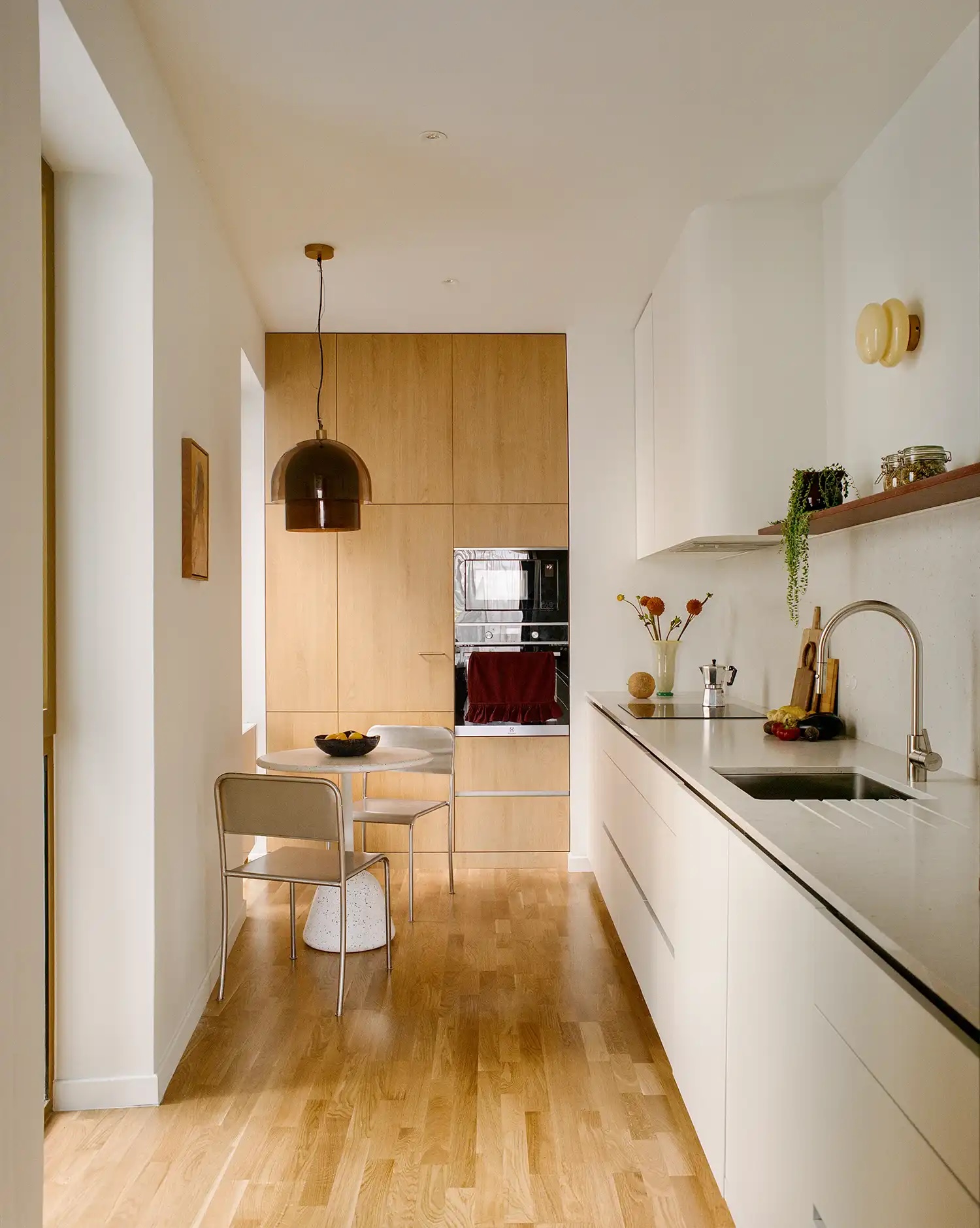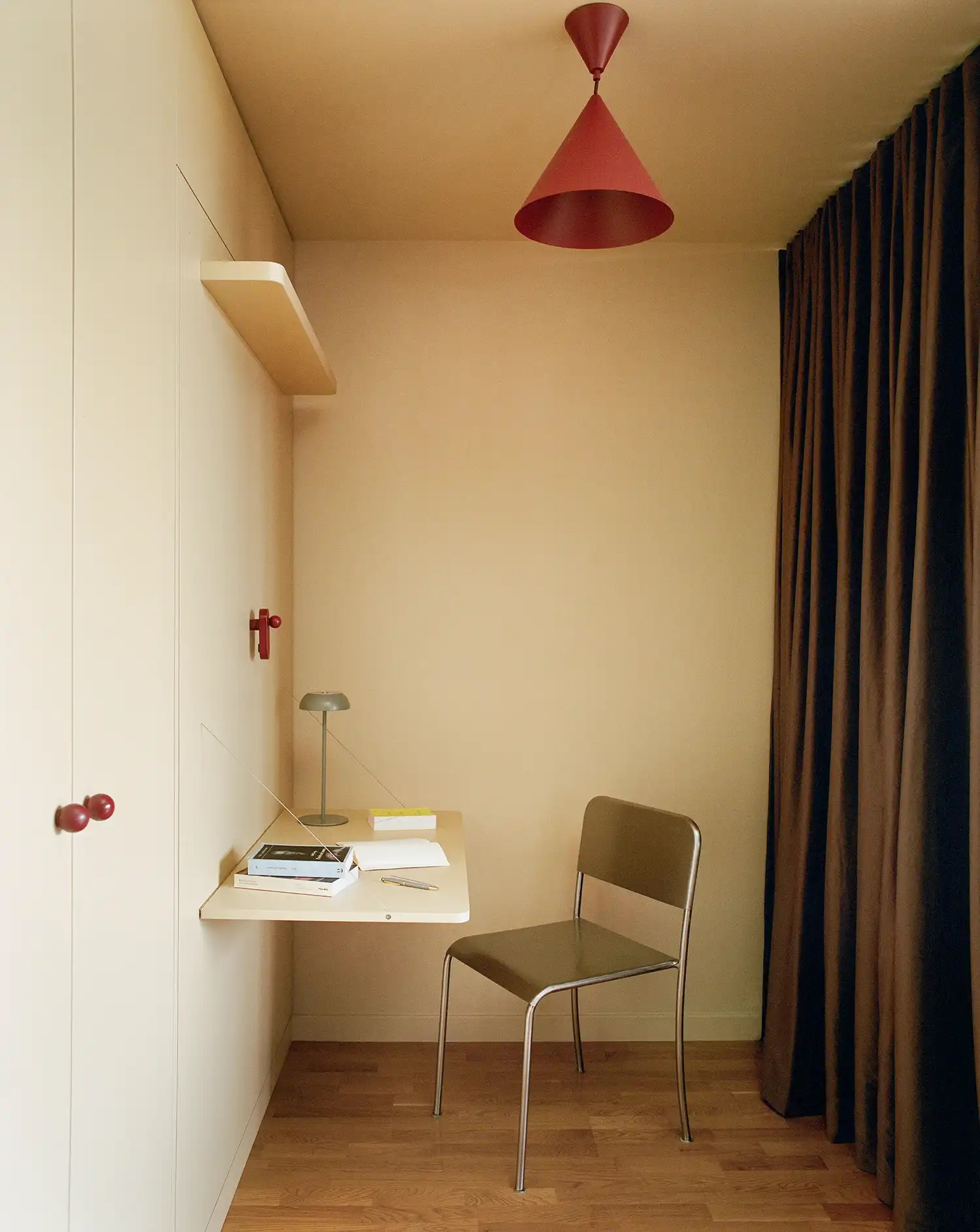 L’ingéniosité technique se conjugue à la multi-fonctionnalité dans la pièce principale tout en longueur. Afin d’optimiser l’espace, les architectes ont repensé le séjour grâce à un rideau acoustique double face, créant ainsi une zone modulable qui se transforme tour à tour en chambre, bureau et dressing. Cet élément unique et transformable permet à ce petit appartement de respirer, s’adaptant aux besoins du quotidien sans nuire à la clarté du design. Il s’agit d’une solution pragmatique qui reflète la formation diversifiée des architectes, alliant le raffinement suisse à une profonde compréhension de la densité urbaine.