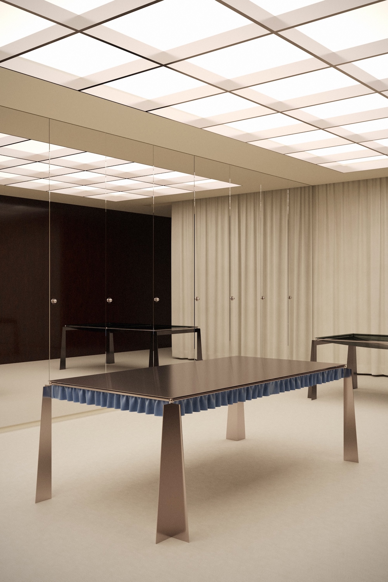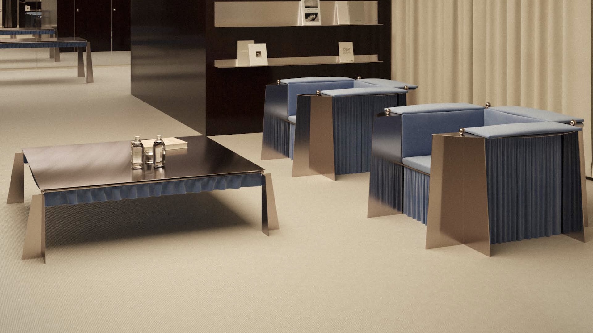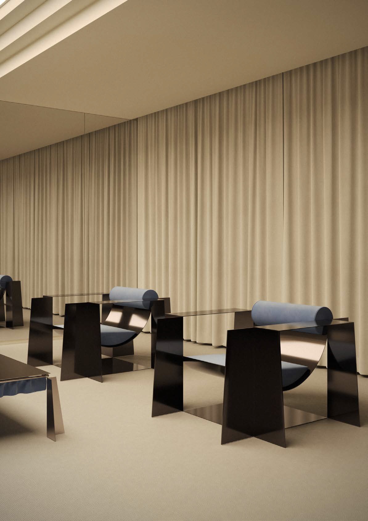 Les pièces — table basse, bureau, fauteuil, chaise, chilienne et piédestals — oscillent entre tension et légèreté. Le métal, travaillé en inox brossé ou en laque noire brillante, assure la structure et la verticalité. Les éléments suspendus, en satin de laine Saphir violacé, apportent du mouvement et une sensualité inattendue.