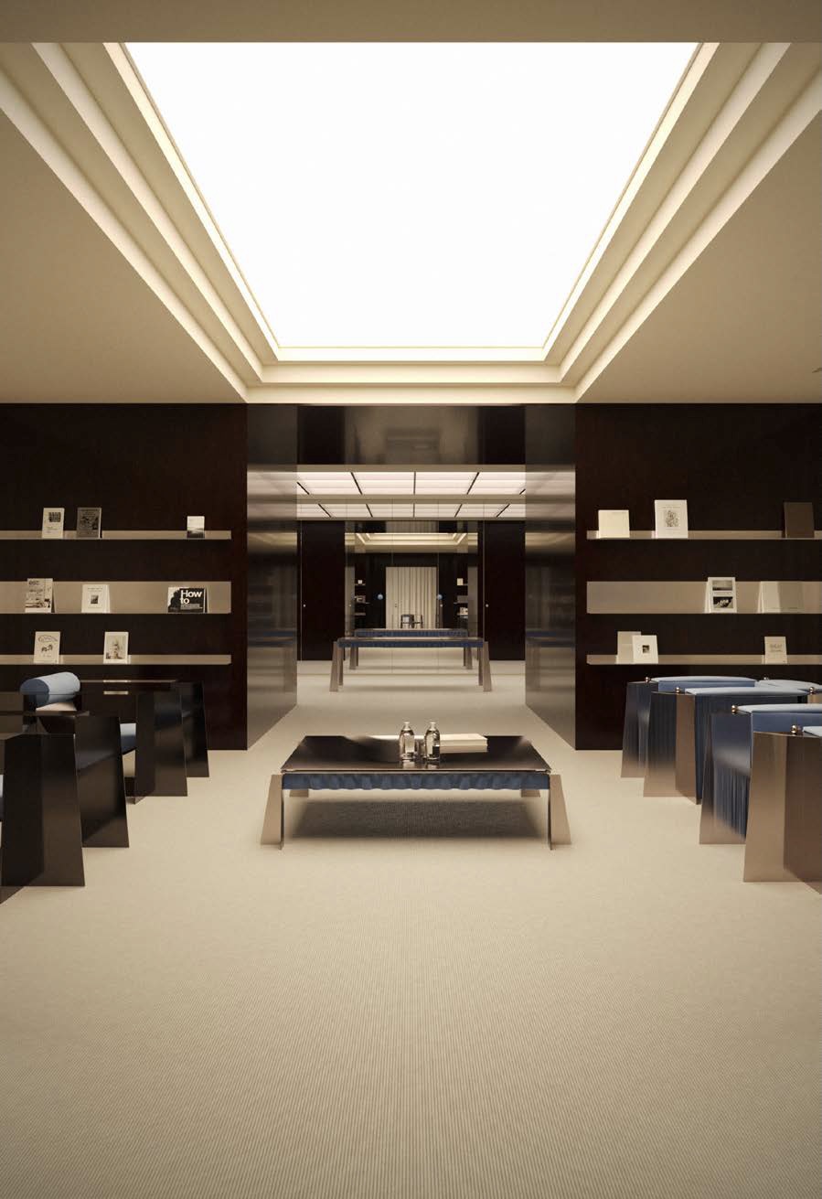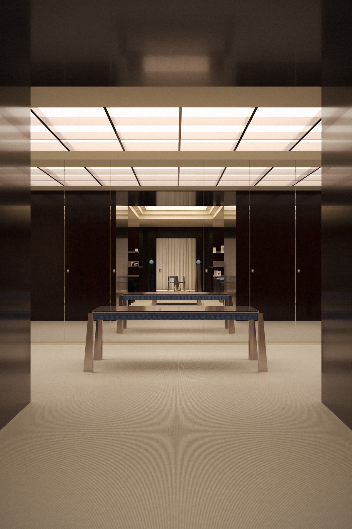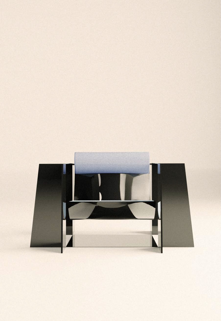 Les pièces — table basse, bureau, fauteuil, chaise, chilienne et piédestals — oscillent entre tension et légèreté. Le métal, travaillé en inox brossé ou en laque noire brillante, assure la structure et la verticalité. Les éléments suspendus, en satin de laine Saphir violacé, apportent du mouvement et une sensualité inattendue.