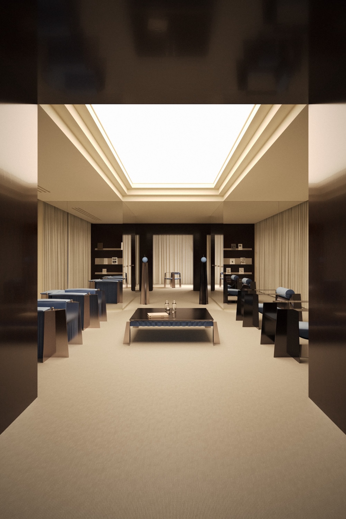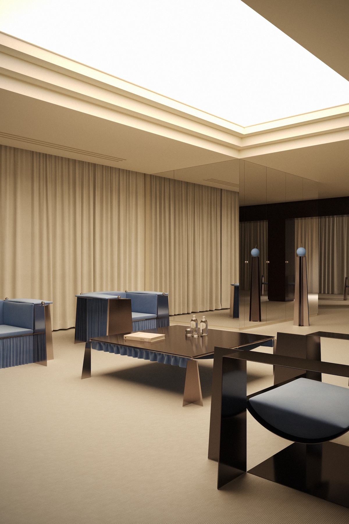 La collection ré-interprète cet héritage avec le langage propre au studio : un design sculptural et précis, traversé d’une douceur inattendue. Le drapé — inspiré du classicisme et des formes textiles théâtrales que l’on retrouvait dans les maisons “habillées” de l’époque, joue un rôle central.
