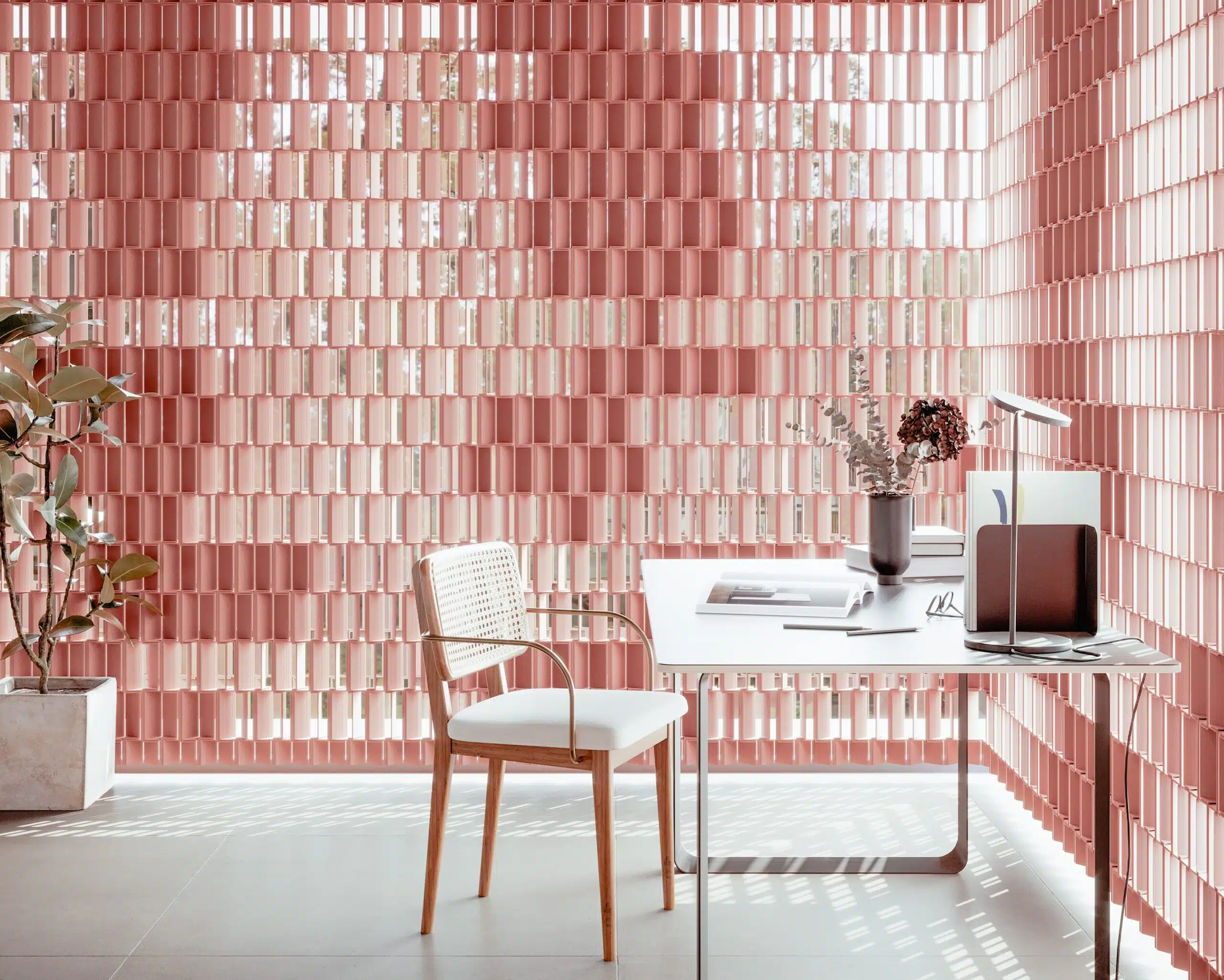 La plateforme propose deux gammes distinctes. Les systèmes destinés aux espaces professionnels, types bureaux, hôtels, restaurants exploitent des formats généreux pouvant atteindre 1 x 2 mètres par module. Cette échelle permet de créer des compositions rythmées où les motifs se répètent sans rupture visible entre les joints. Trois langages formels structurent l’offre : Curve joue sur les ondulations organiques, Nazka développe des trames géométriques inspirées du graphisme précolombien, tandis que Mesh propose des tissages ajourés.