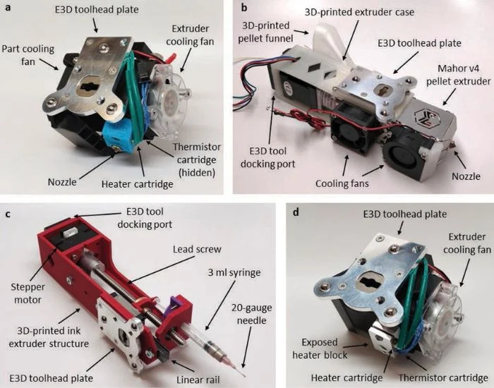 C’est donc dans ce contexte qu’intervient cette nouvelle plateforme d’impression 3D. Elle s’appuie sur une solution d’extrusion déjà existante mais “revisitée”. Concrètement, les chercheurs ont ajouté 4 extrudeurs afin qu’ils puissent gérer un type de matériau chacun, quelle que soit sa forme. Vous imaginez bien les difficultés techniques que cela suppose.