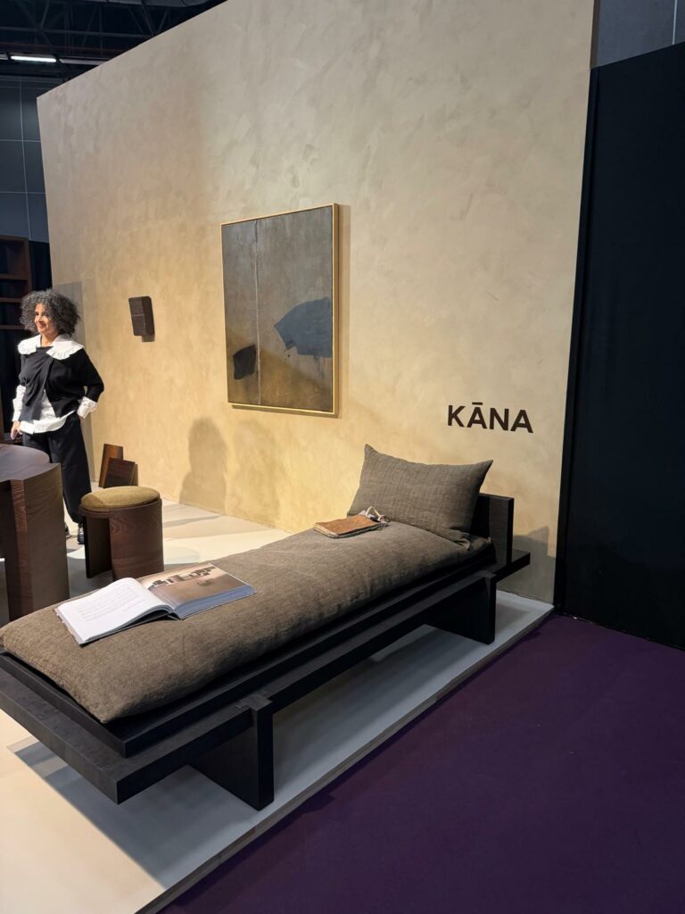 Loin du tumulte du salon, l’espace de la marque belge KĀNA m’a offert une véritable respiration. Leur daybed (lit de repos) est une leçon de minimalisme brutaliste et contemplatif. Une structure en bois sombre aux lignes franches et orthogonales, surmontée d’un coussin à la texture brute.