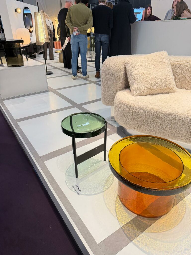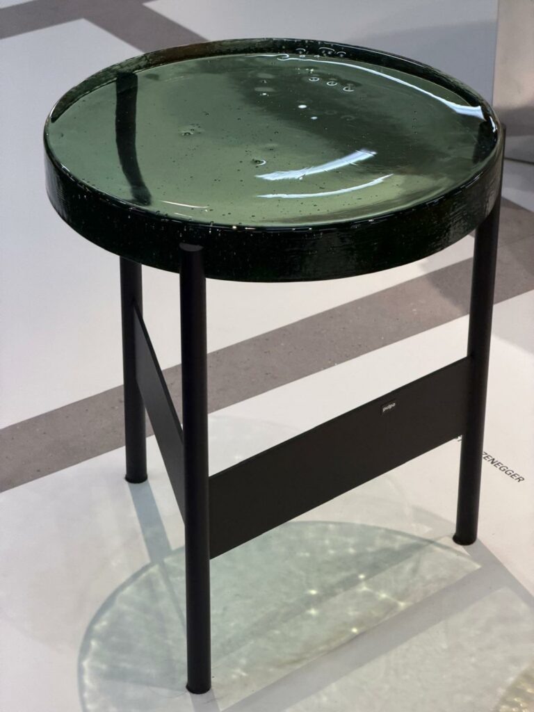 Mon premier arrêt s’est fait devant la série de tables d’appoint Alwa Three, imaginée par le designer Sebastian Herkner pour la maison d’édition allemande pulpo. Ce qui fascine ici, c’est la densité et la vérité du matériau. Le plateau en verre coulé, d’une épaisseur inouïe, semble avoir été figé en plein mouvement. Qu’il soit d’un vert forêt profond ou d’un ambre solaire, on y lit les bulles d’air, les ondulations et les imperfections de l’eau captive. Cette masse vibrante est portée par un piétement métallique noir d’une rigueur quasi architecturale. C’est le contraste magistral entre la grille (l’acier) et l’organique (le verre artisanal) qui donne à l’objet toute sa tension poétique.