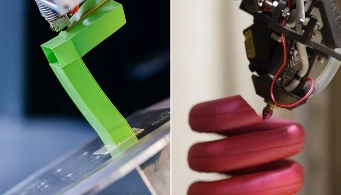 Dans l’impression 3D multi-axes, le matériau suit la géométrie réelle de la pièce (crédits photos : Université de Stuttgart (à gauche) et MAGE Printing (à droite)).