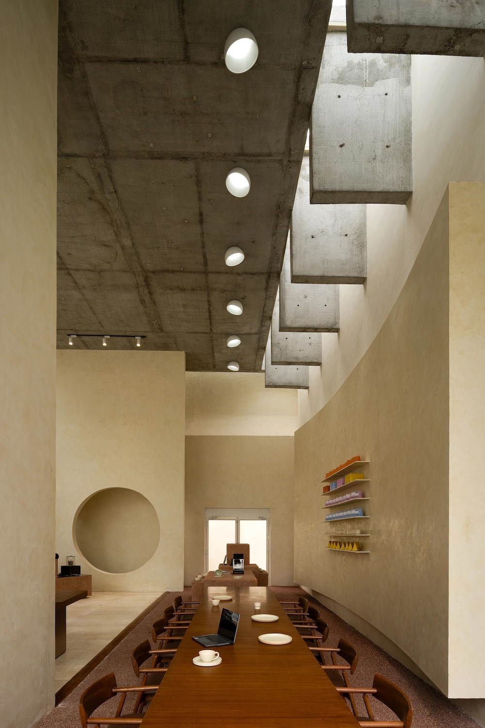 La lumière est omniprésente tout au long de la journée. Une série de poutres basses et équidistantes animent le plafond du lever au coucher du soleil, tandis que la verrière capte la douce lumière du soir et la diffuse délicatement jusqu’au comptoir. Le volume total est limité à 6,7 mètres, mais plutôt que d’exagérer la hauteur, le design joue sur la perception : les plans du plafond, tantôt plus hauts, tantôt plus bas, guident le regard à travers les recoins et les anfractuosités de l’espace.