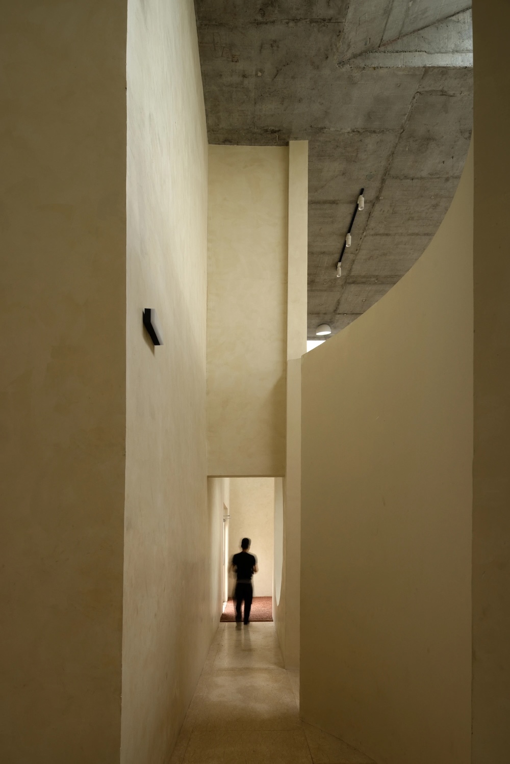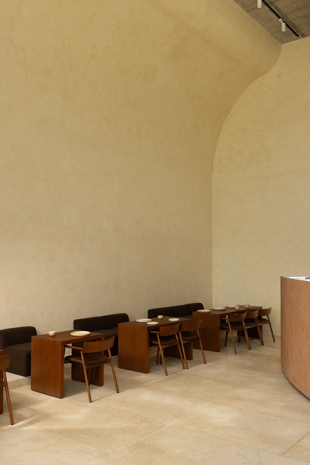 Au centre trône un comptoir semi-elliptique qui structure l’espace. Sa forme s’élargit et attire le regard vers une verrière, puis vers le mur arqué derrière le bar, créant une progression à la fois réfléchie et naturelle.