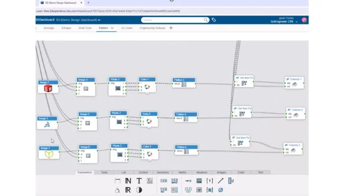 Un aperçu de certains des nœuds créés à l’aide du script visuel sur la plateforme 3DEXPERIENCE pour entrelacer trois images différentes.