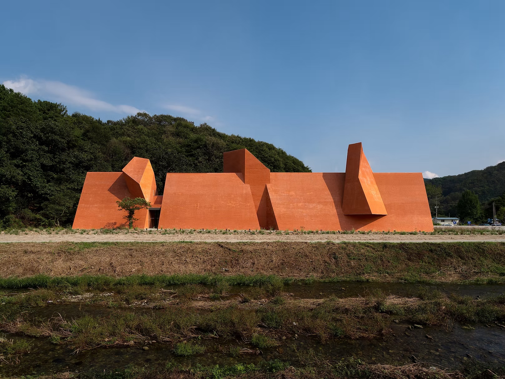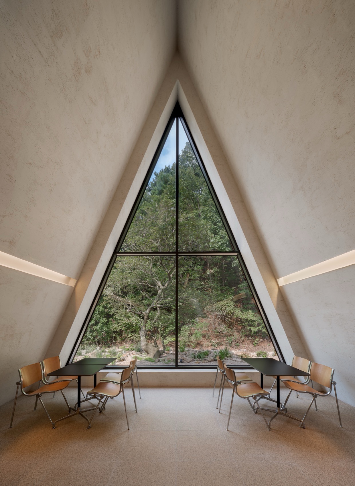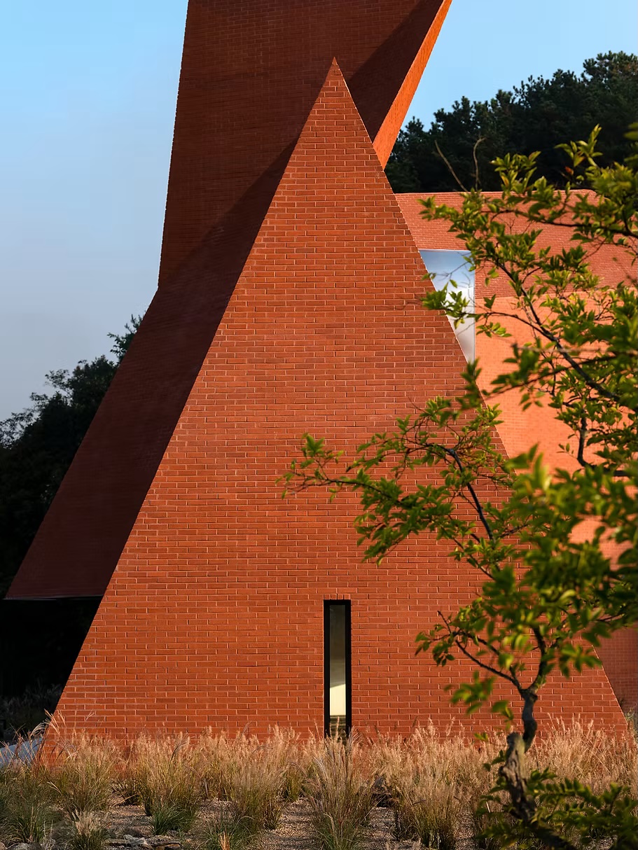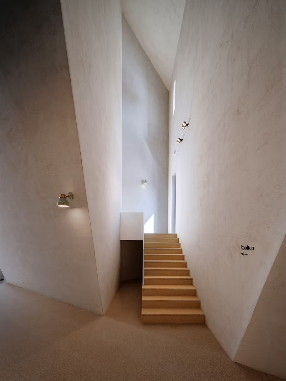 Ce choix de matériau, à la fois brut et intemporel, ancre le bâtiment composé de volumes angulaires dans le paysage forestier tout en lui offrant une identité forte. La texture irrégulière capte les variations de lumière au fil de la journée, faisant vibrer la façade sans jamais rompre sa sobriété. Plus qu’un simple revêtement, cette enveloppe devient un dispositif sensible — un seuil tactile et visuel qui prolonge, dès l’extérieur, l’expérience introspective pensée par les architectes.