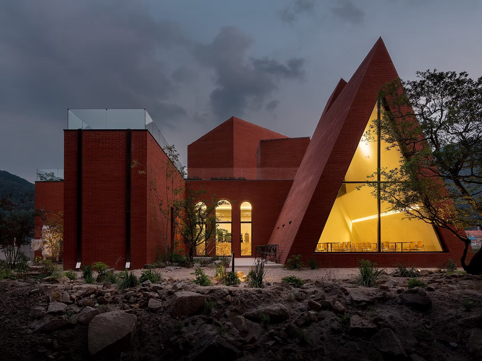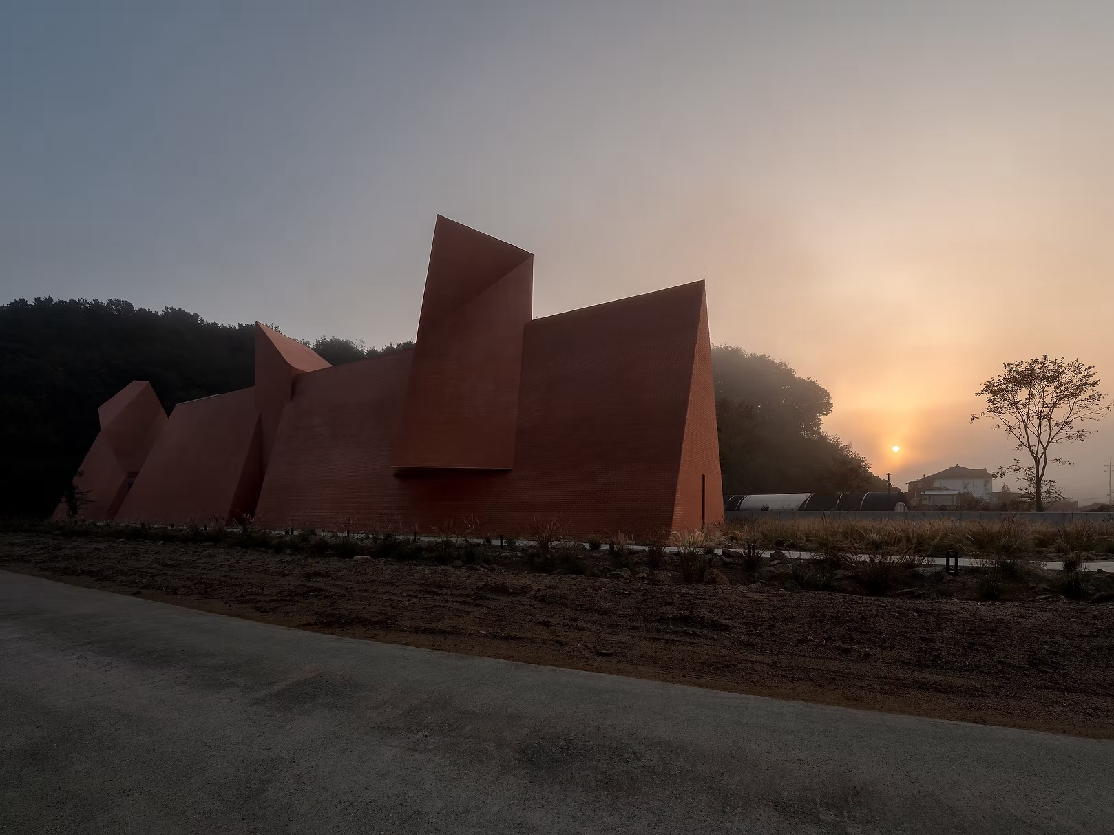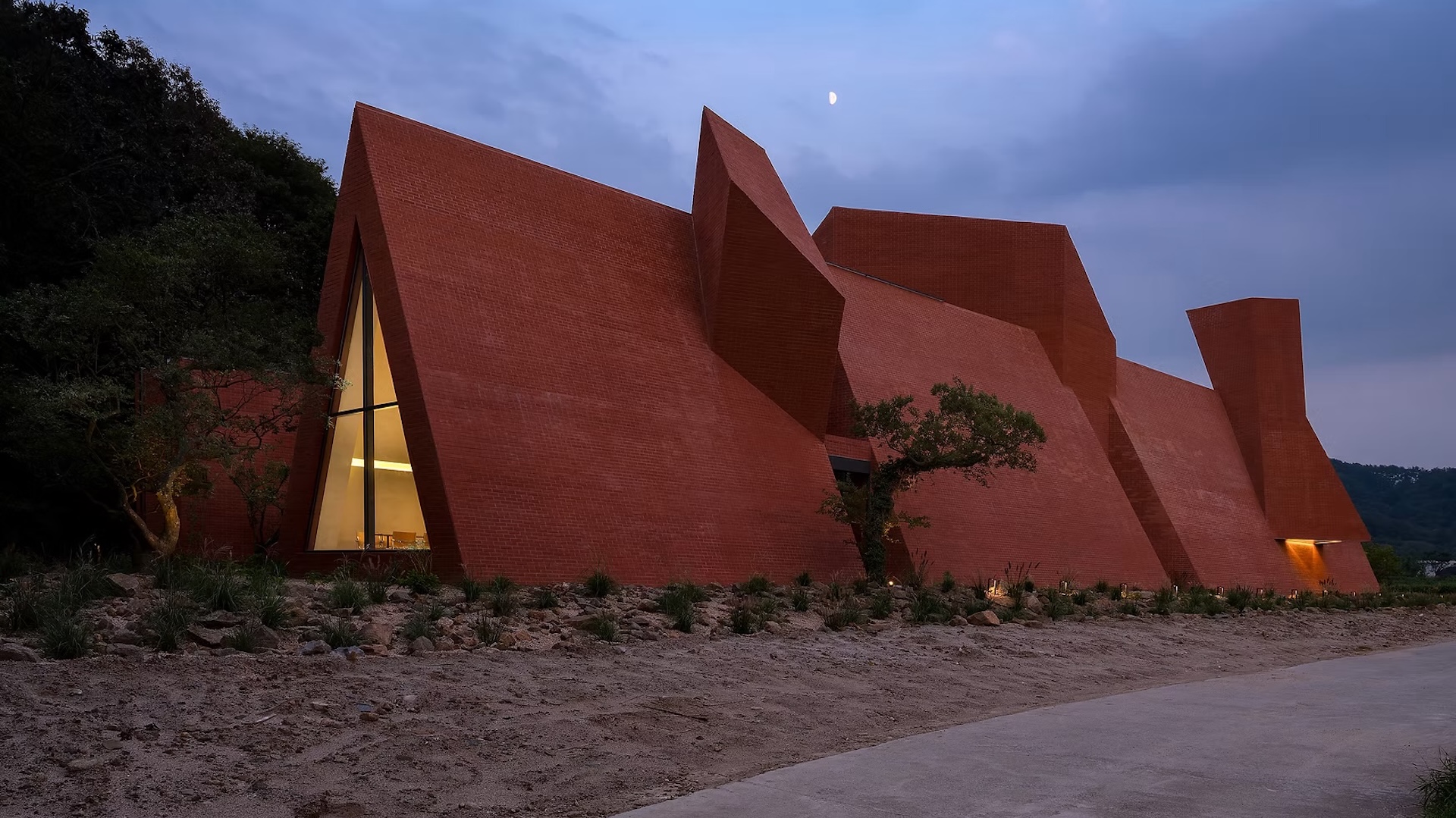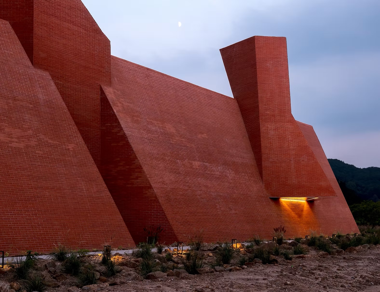 Ce choix de matériau, à la fois brut et intemporel, ancre le bâtiment composé de volumes angulaires dans le paysage forestier tout en lui offrant une identité forte. La texture irrégulière capte les variations de lumière au fil de la journée, faisant vibrer la façade sans jamais rompre sa sobriété. Plus qu’un simple revêtement, cette enveloppe devient un dispositif sensible — un seuil tactile et visuel qui prolonge, dès l’extérieur, l’expérience introspective pensée par les architectes.