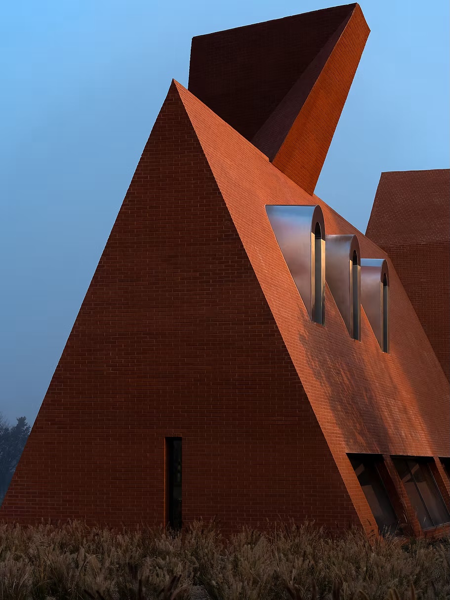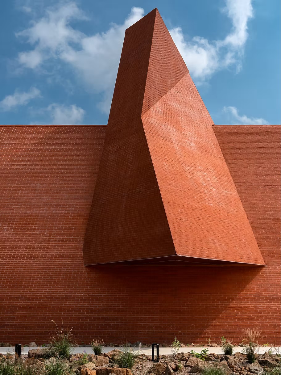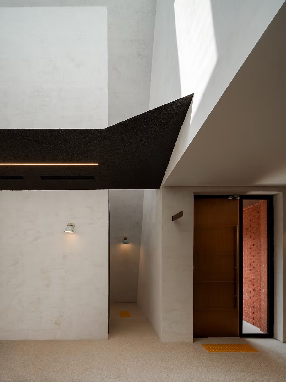 À l’extérieur, le bâtiment se distingue par une enveloppe monolithique en brique d’une grande subtilité, qui confère au lieu une matérialité chaleureuse tout en restant fidèle à son langage minimaliste. La brique est ici travaillée comme une peau vivante : posée avec précision, parfois ajourée, elle laisse filtrer la lumière et suggère plus qu’elle ne montre.