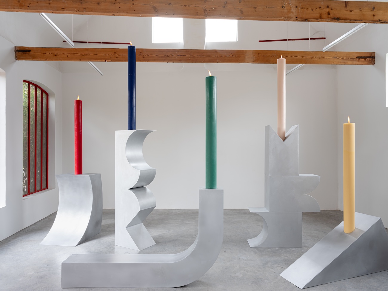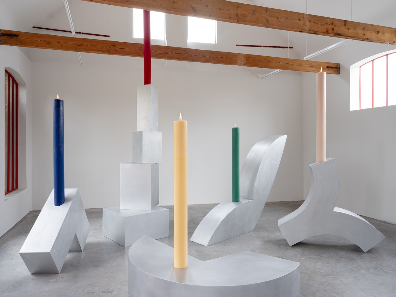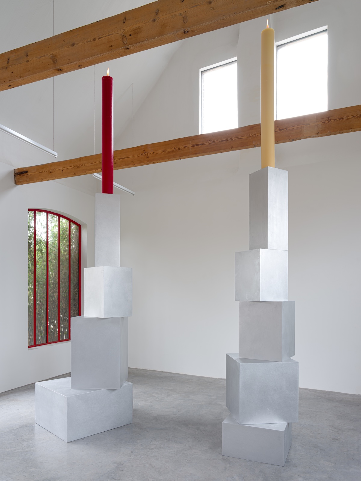 L’installation se déploie comme un ensemble cohérent d’éléments distincts : chaque œuvre conserve son autonomie tout en dialoguant avec les formes environnantes. Une grande bougie colorée couronne le sommet de chaque structure, introduisant une dimension temporelle. Au fur et à mesure que la bougie se consume, l’objet subit une transformation lente et irréversible. Ce qui semble statique au départ devient sujet au changement.