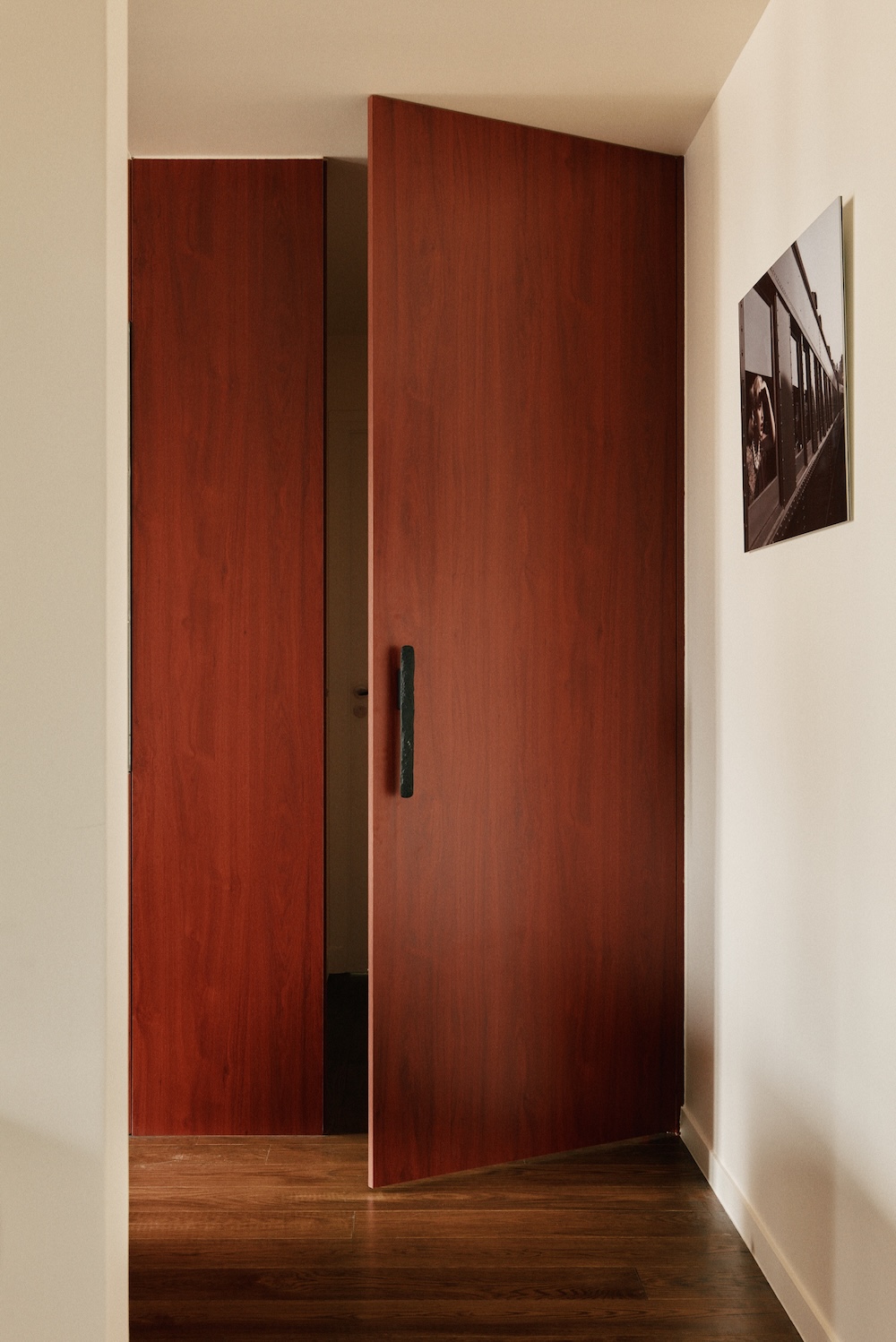 Le parquet d’origine a été conservé, restauré, poncé et teinté pour harmoniser l’ensemble. Une bibliothèque sur mesure en bois rouge et acier, intégrant la télévision, structure un mur entier du séjour. Deux canapés gris font face à cet ensemble, définissant l’espace salon. Une table basse blanche appartenant aux clients est mise en valeur par une suspension lumineuse. Une porte dissimulée dans le mobilier mène à l’espace nuit via un vestibule sombre.