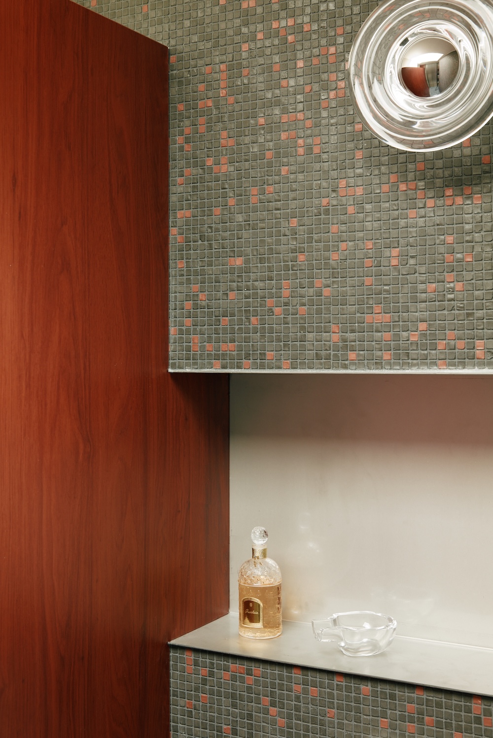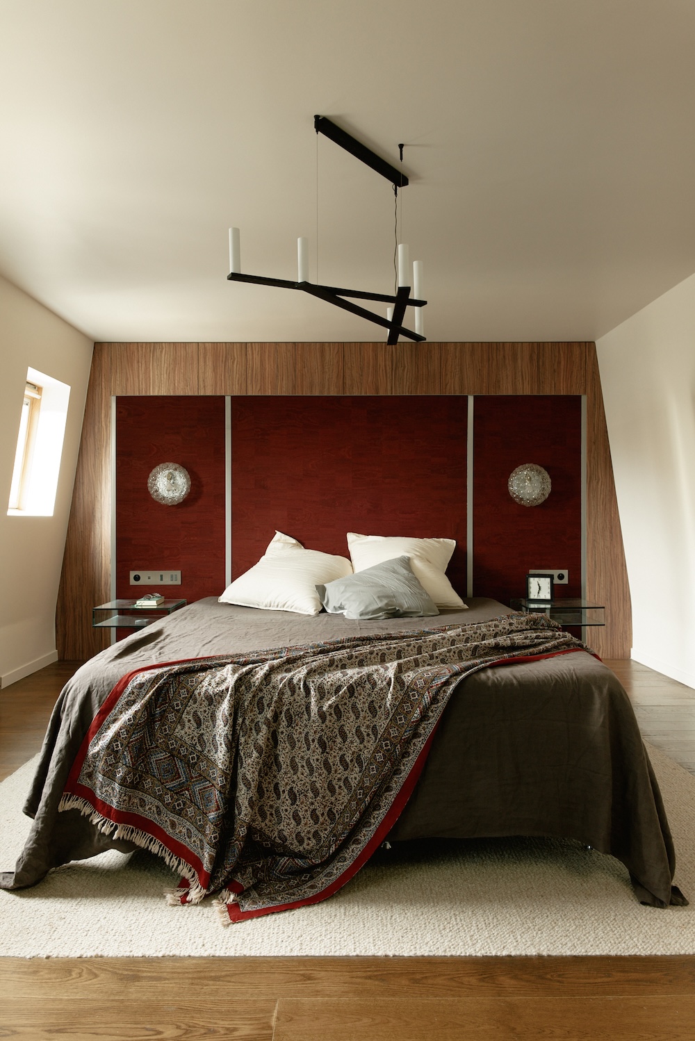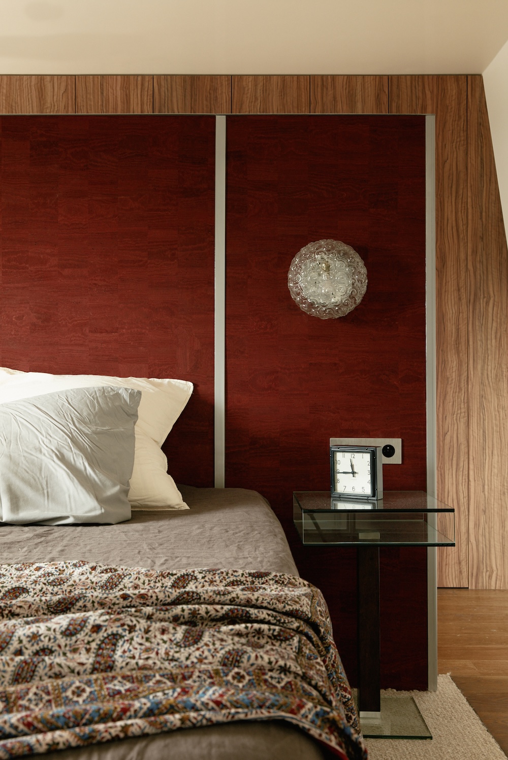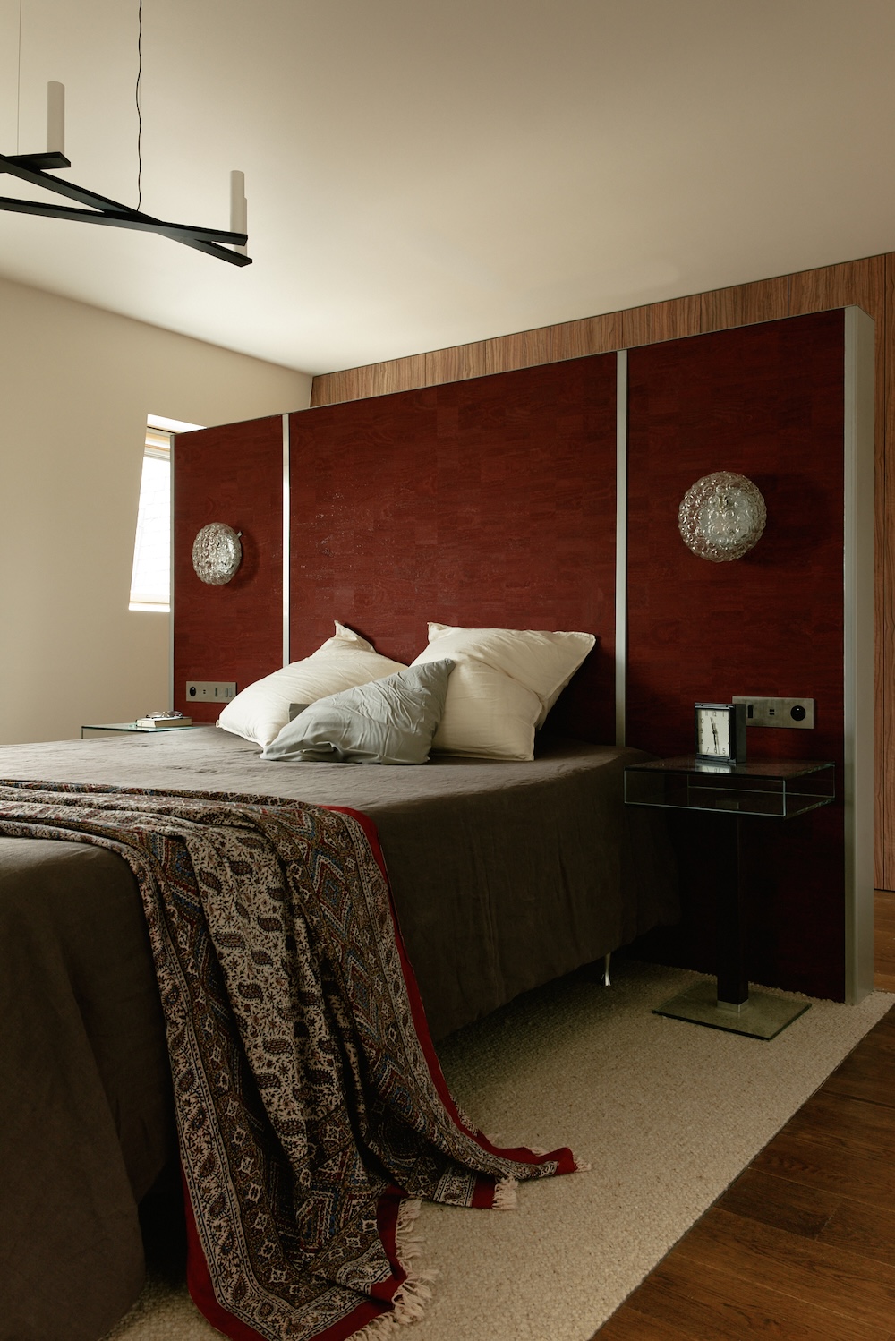 Au centre de la suite, une suspension éclaire un tapis intégré dans une découpe du parquet. La tête de lit sur mesure, en liège rouge avec détails en acier, est doublée d’un miroir à l’arrière. Deux appliques vintage encadrent le lit. Derrière, un dressing avec façades en bois d’olivier complète l’espace.