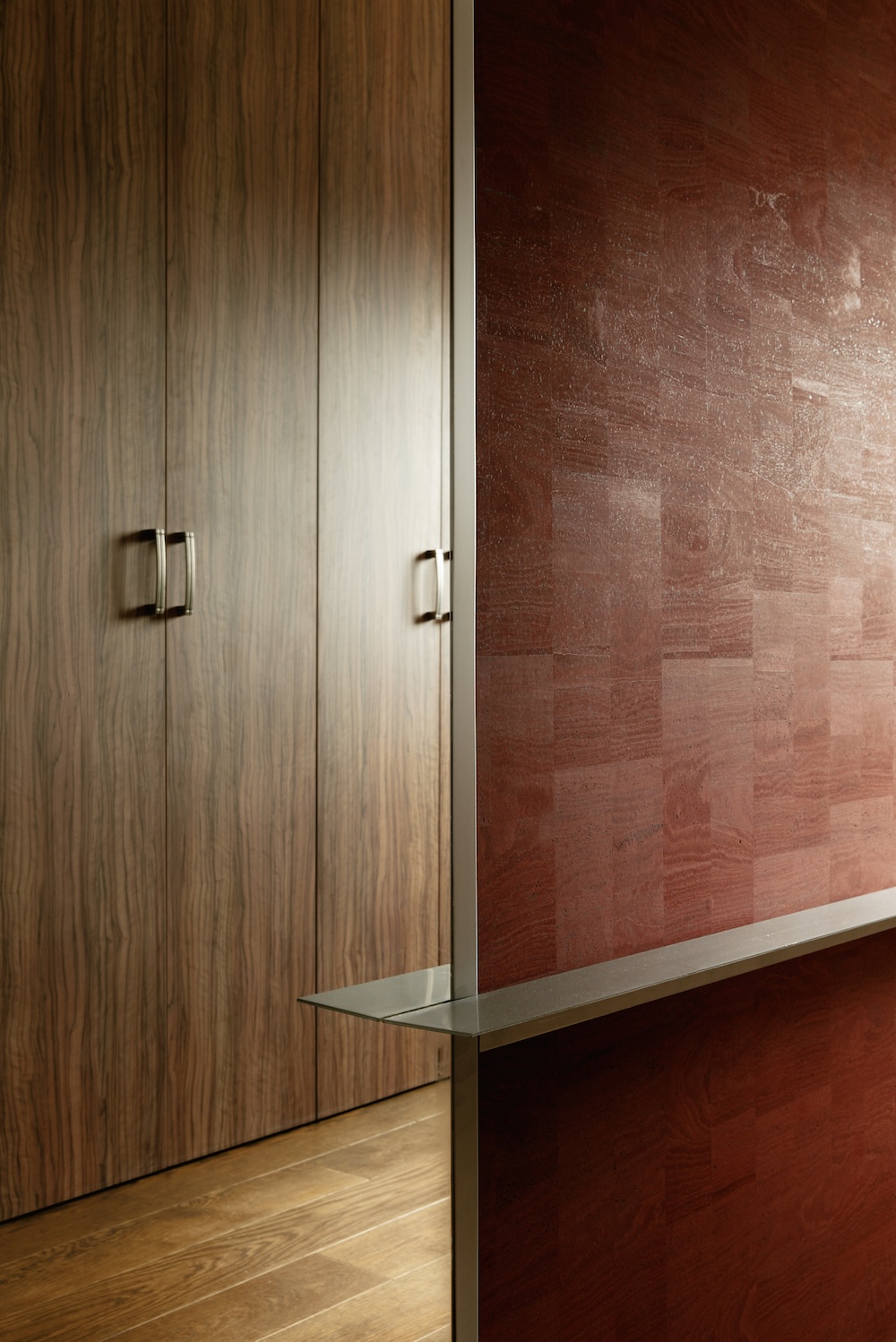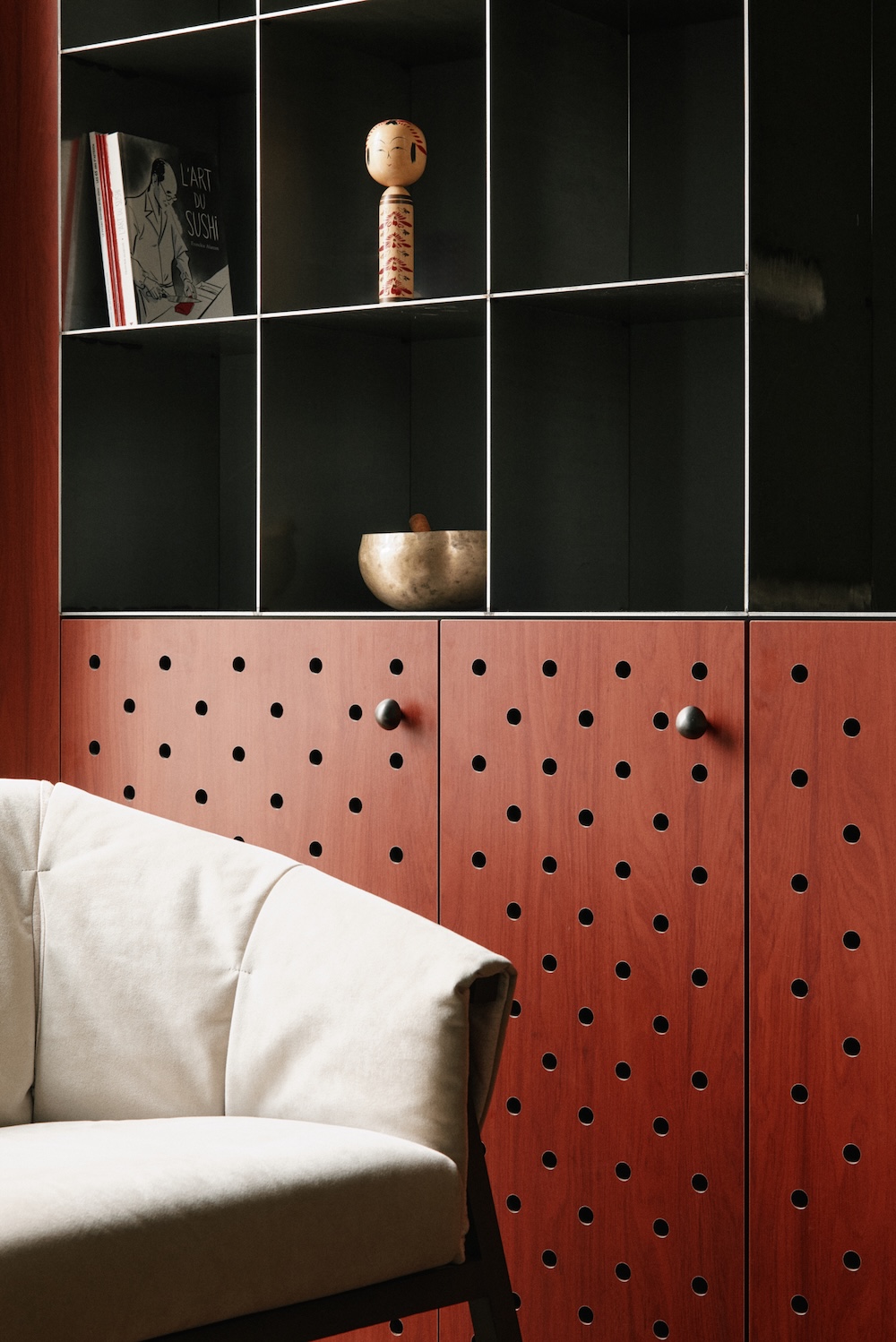 La majorité du mobilier est dessinée sur mesure, en parfaite harmonie avec l’architecture. Les matériaux choisis — bois, liège et métal — associés à une palette de bruns profonds et de rouges, renforcent cette esthétique volontairement singulière.