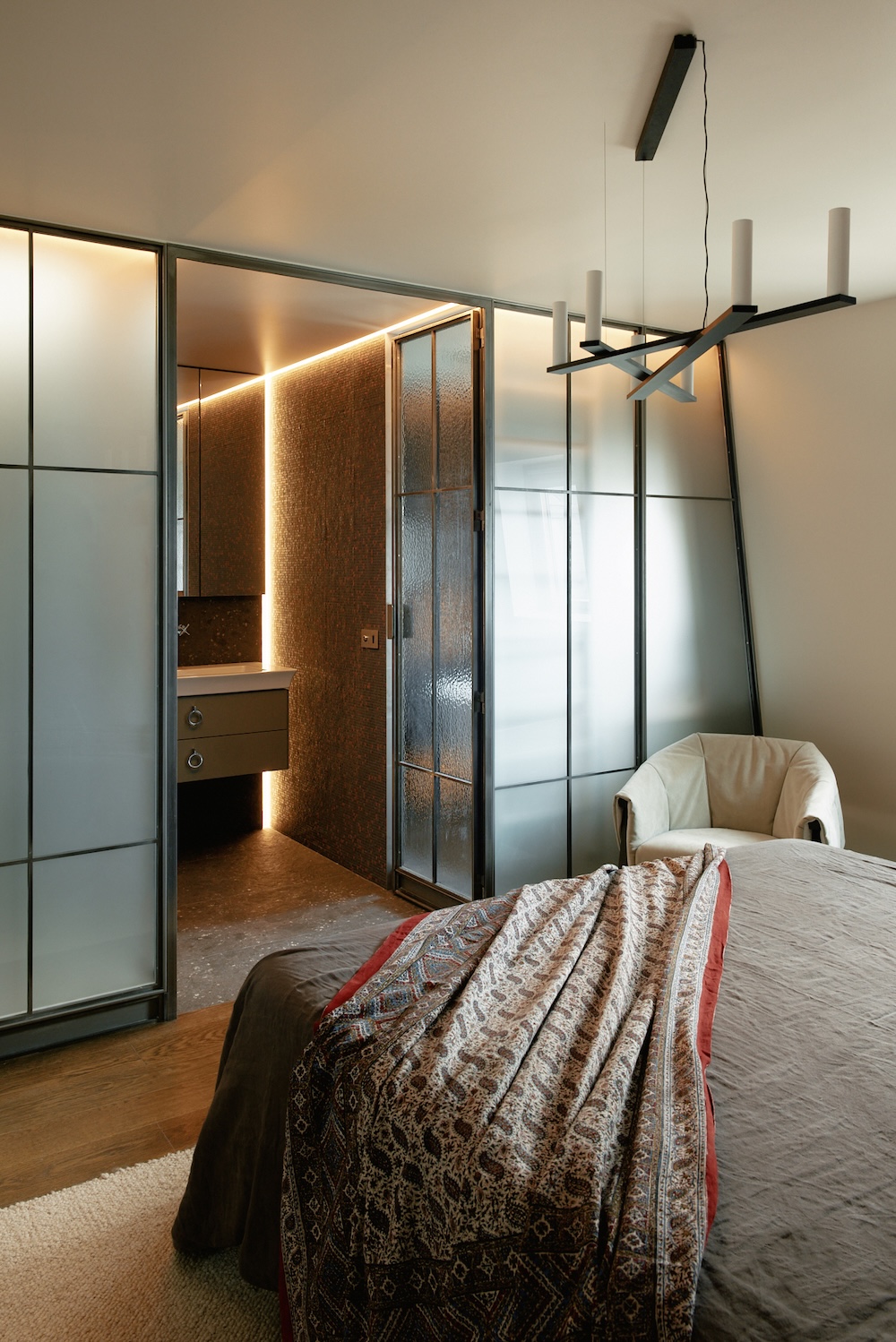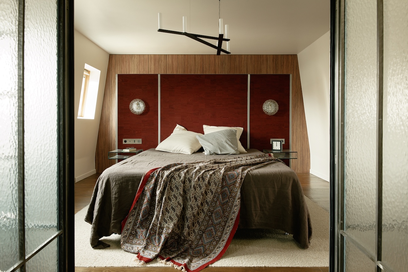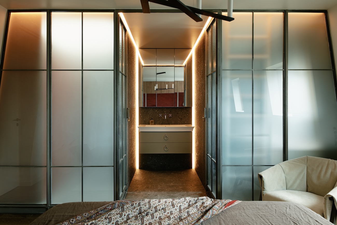 Le plafond du séjour a été ouvert pour intégrer le volume des combles, créant un espace en double hauteur avec charpente apparente. Dans la suite, le mur incliné côté cour a été reproduit en symétrie afin d’unifier le volume. Le lit est placé au centre, avec un dressing à l’arrière et, en face, une cloison vitrée en acier dissimulant la salle de bain.