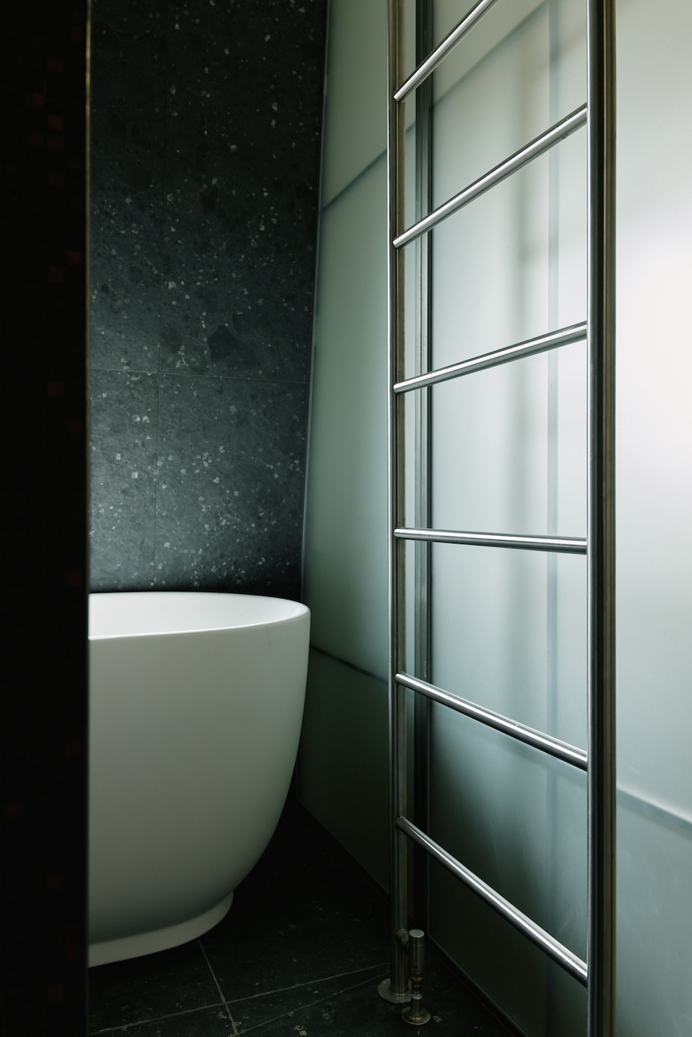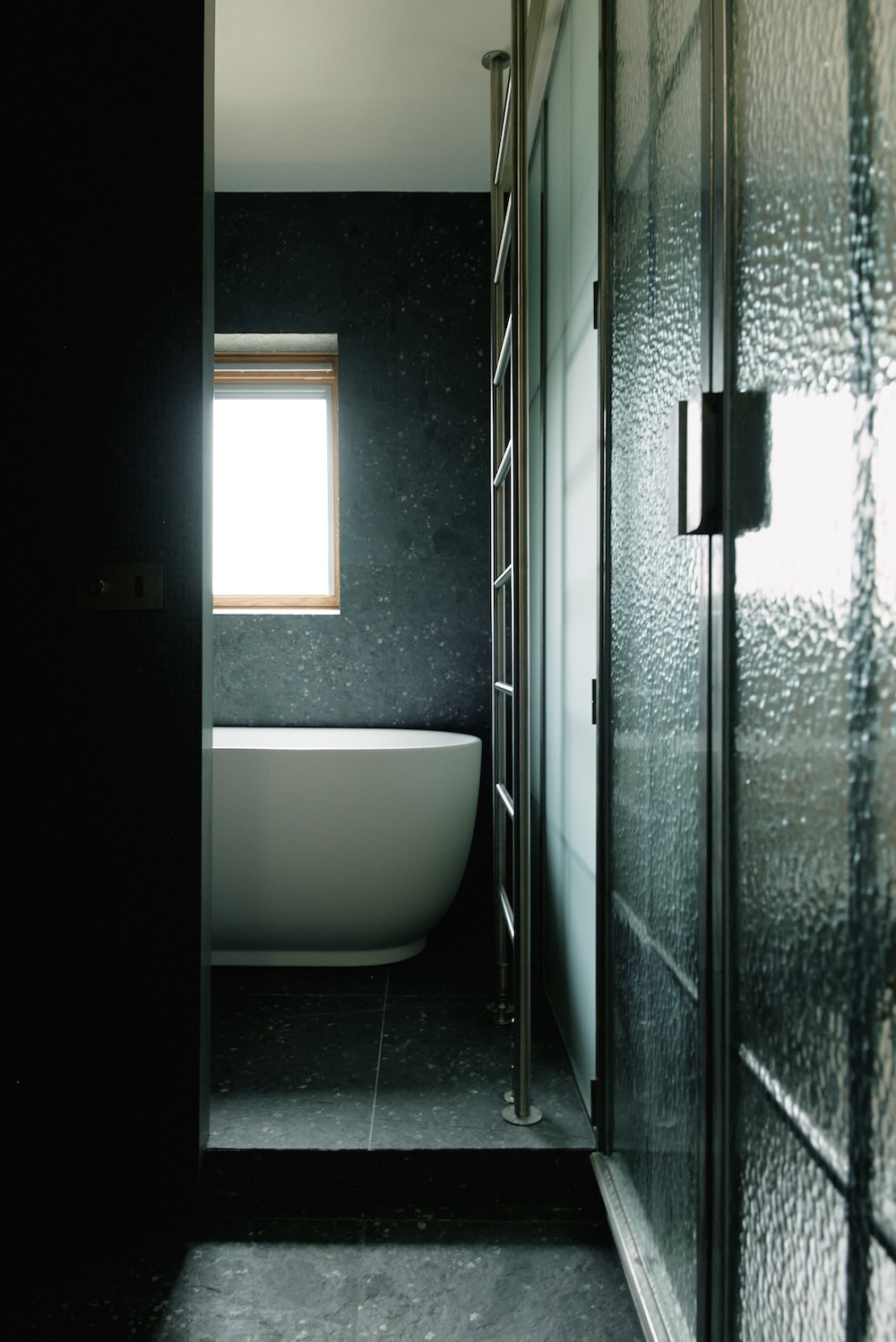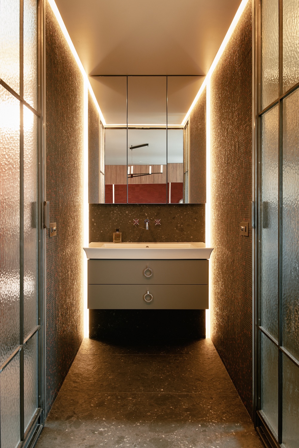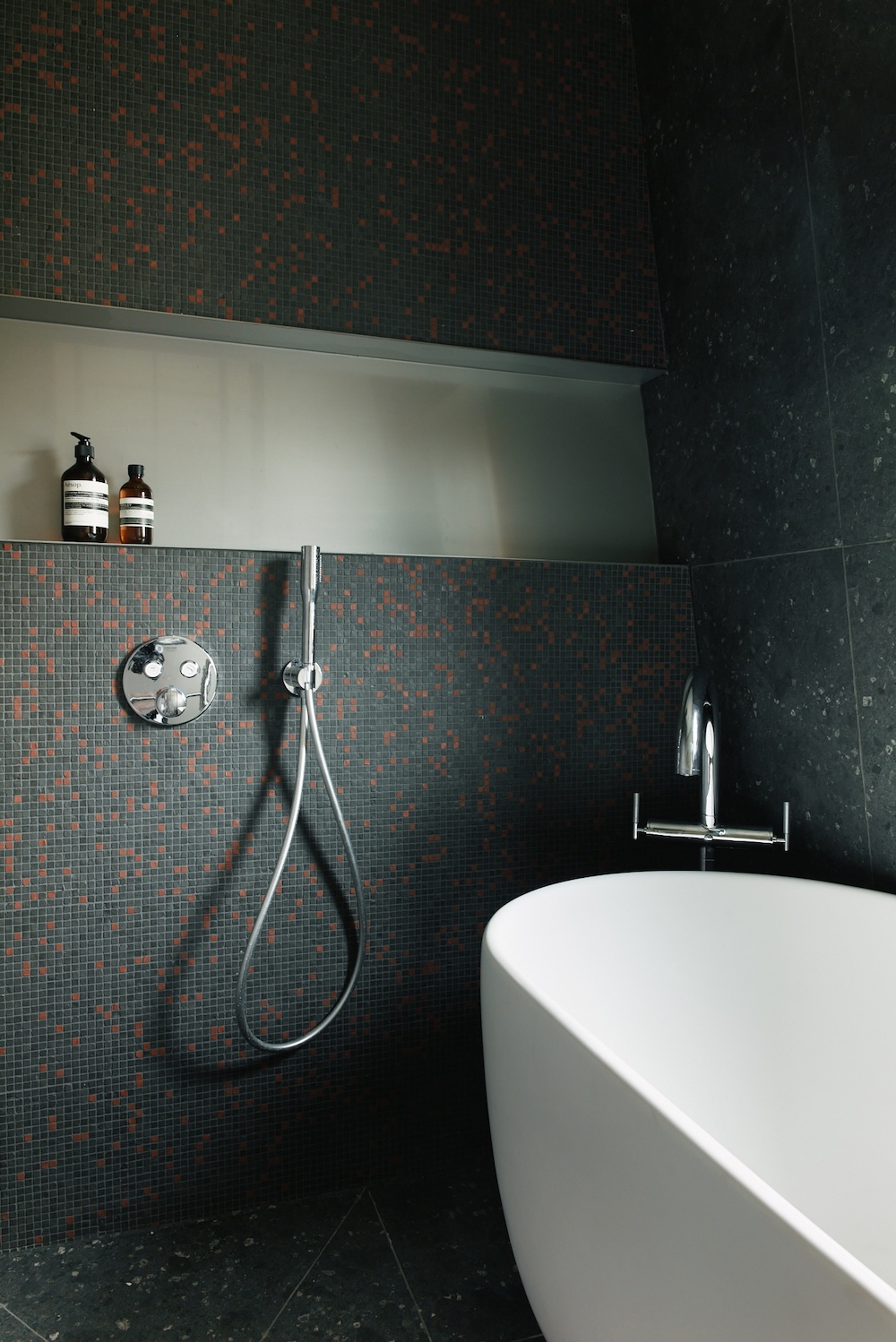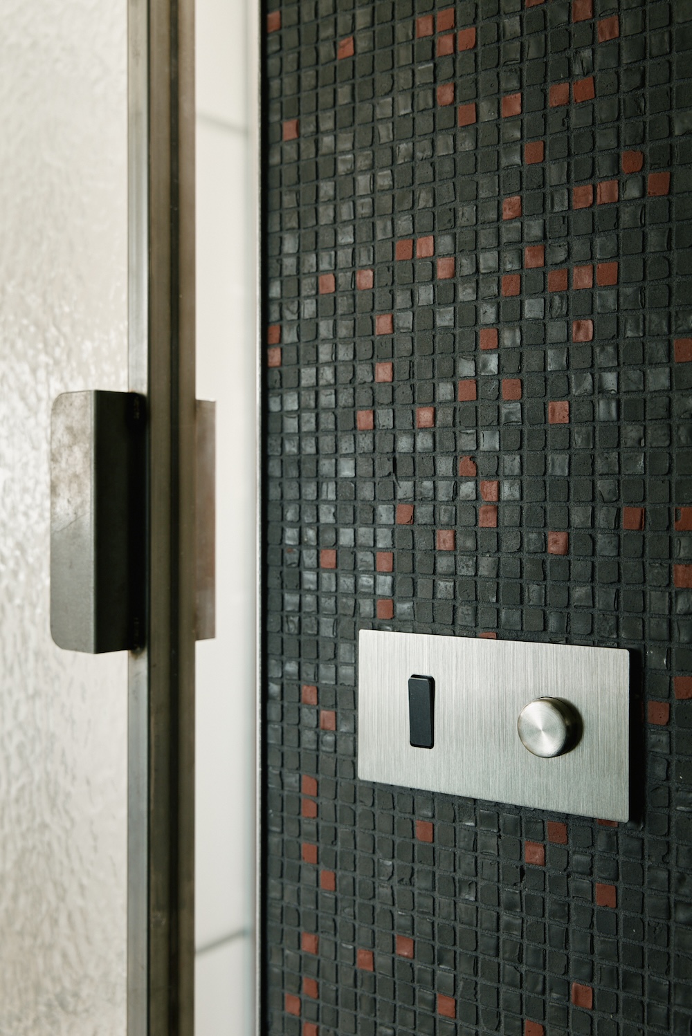 La salle de bain, située derrière une cloison vitrée texturée, adopte une ambiance minérale. Le sol est en grès cérame noir structuré, et les murs sont habillés de mosaïques noires et rouges. L’éclairage est indirect, complété par des appliques murales. Un meuble vasque sur mesure et une baignoire occupent l’espace, tandis qu’un meuble dissimule lave-linge et sèche-linge.