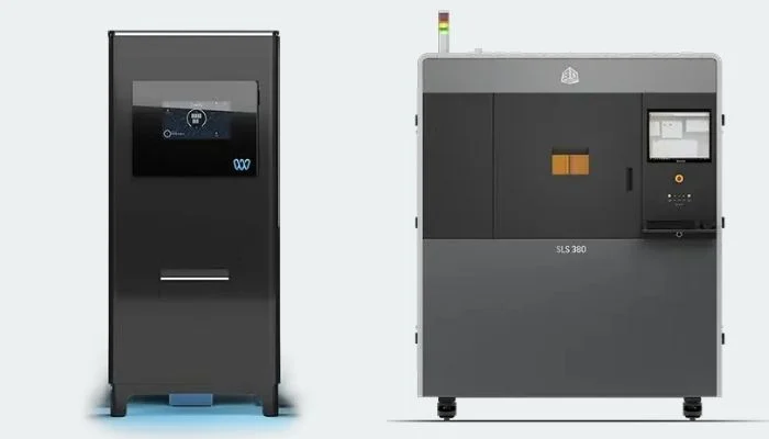 3D Systems, qui n’a plus besoin d’être présenté dans le secteur de la fabrication additive, propose deux imprimantes SLS dans son catalogue : la SLS 300 et la SLS 380. La première, avec un volume d’impression de 300 x 300 x 300 mm, est destinée aux environnements où l’espace est limité, tels que les bureaux, les laboratoires ou les petits ateliers, car elle n’occupe que 0,45 m² au sol. Elle utilise une prise de courant standard, est peu bruyante et ne nécessite ni refroidisseur ni extracteur de fumées. Selon 3D Systems, elle peut être utilisée par du personnel non spécialisé. La poudre est chargée à l’aide de cartouches, ce qui évite la manipulation directe du matériau et élimine le besoin d’une infrastructure dédiée. En contrepartie de cette simplicité, la compatibilité des matériaux est limitée au PA11 et au PA12.