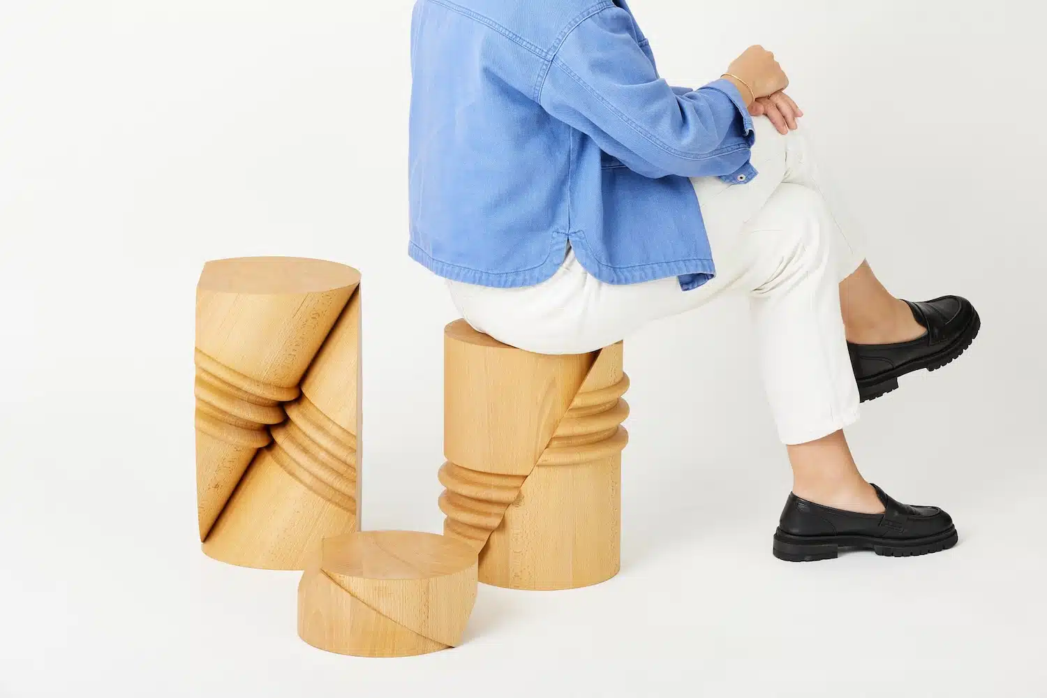 La référence revendiquée est l’argizaiola, fine bougie enroulée autour d’un support de bois utilisée dans les rites religieux du Pays Basque. Les formes hélicoïdales, les torsions visibles sur les corps des tables, les stries régulières rappellent cette corde de cire tendue autour de son axe. Maentler studio cite également les travaux du sculpteur brésilien Sergio Camargo, connu pour ses compositions en reliefs cylindriques qui jouent sur la répétition et le rythme. On n’est pas très loin. Le hasard ne semble avoir joué ici aucun rôle.