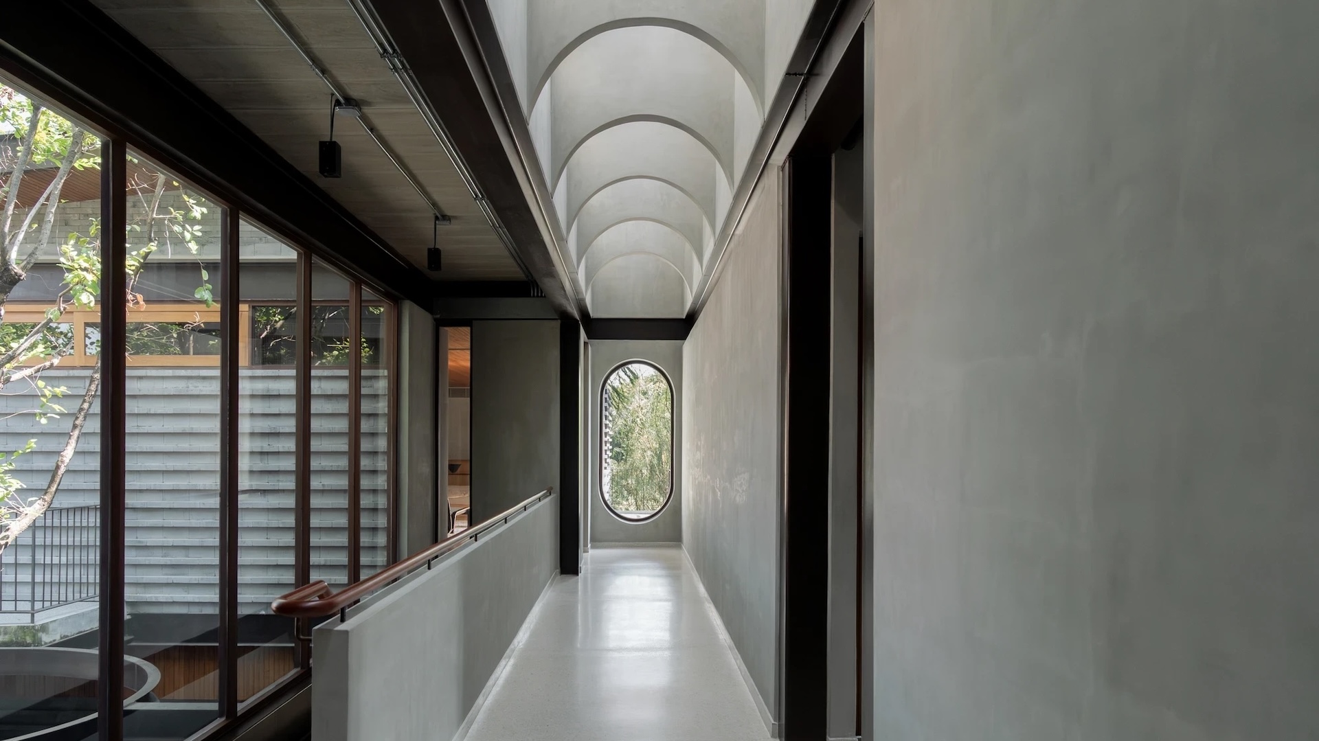 Au-dessus du couloir du deuxième étage, une verrière toute hauteur aux ailettes cintrées instaure une séquence rythmique, évoquant la linéarité des colonnades chinoises classiques, tout en guidant le flux de visiteurs vers la chambre principale dans un parcours spatial chorégraphié.