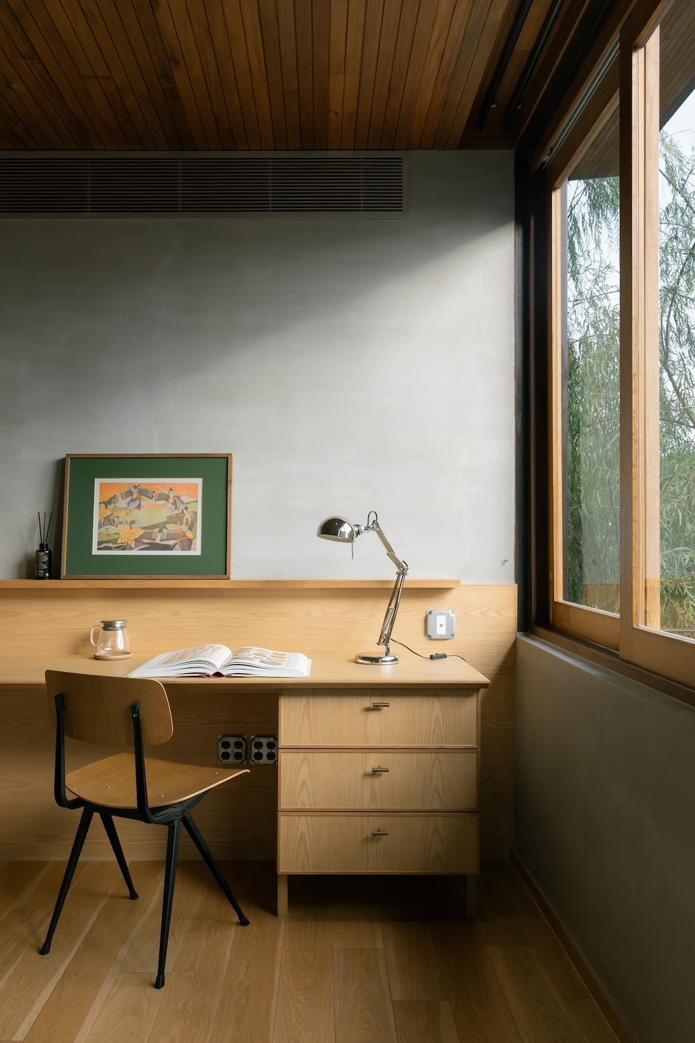 Les idées spatiales s’inspirent de la peinture traditionnelle chinoise, sont analysées et traduites en diagrammes, qui guident les choix architecturaux de simplification, de décalage d’axes et de répétition. Une porte de lune classique est pivotée horizontalement et réinterprétée comme un vide circulaire encadré d’acier. Placée dans la cour, elle marque la transition entre intérieur et extérieur, permettant aux arbres de s’étendre vers le balcon du premier étage et créant un dialogue dynamique entre la maison et son environnement.