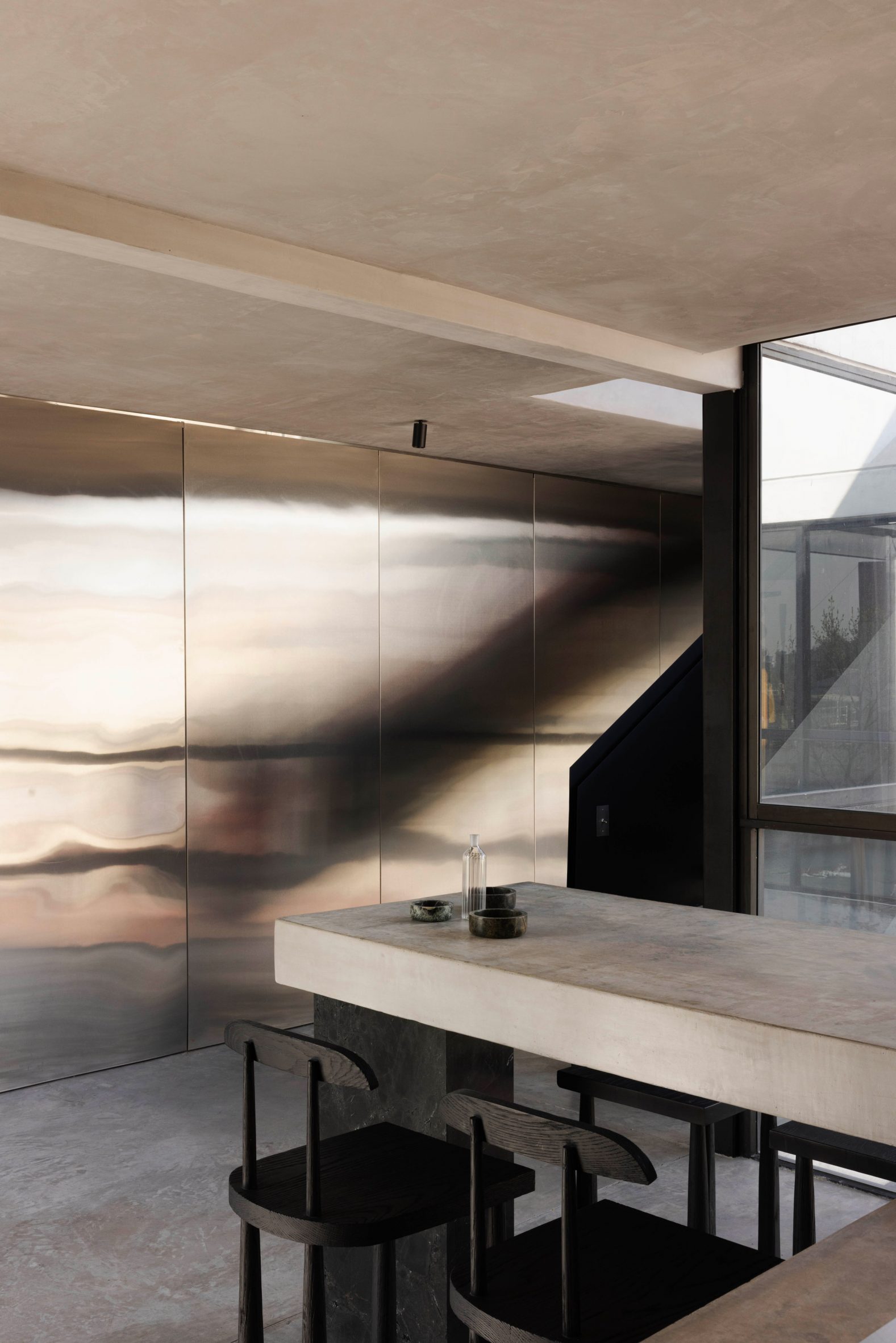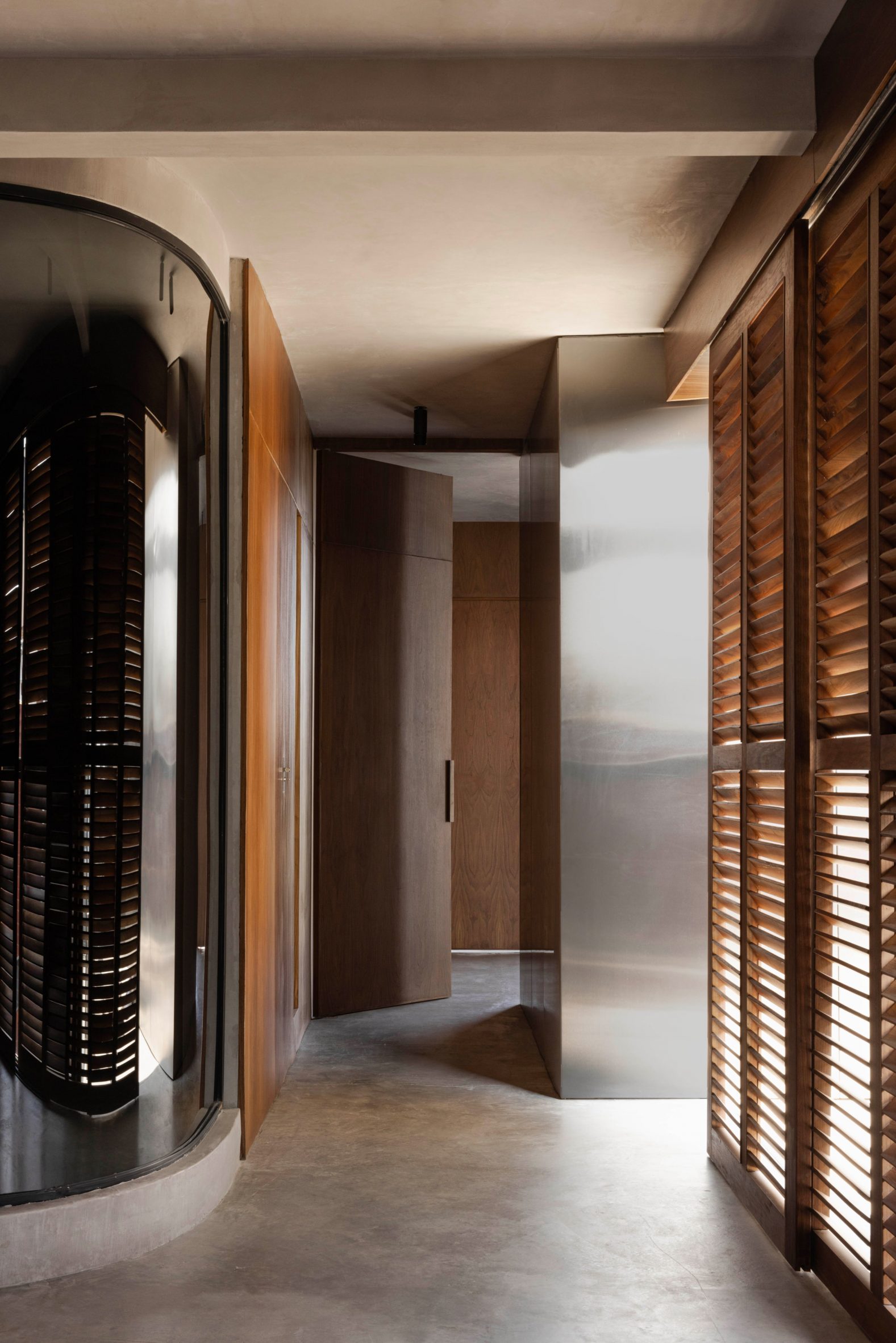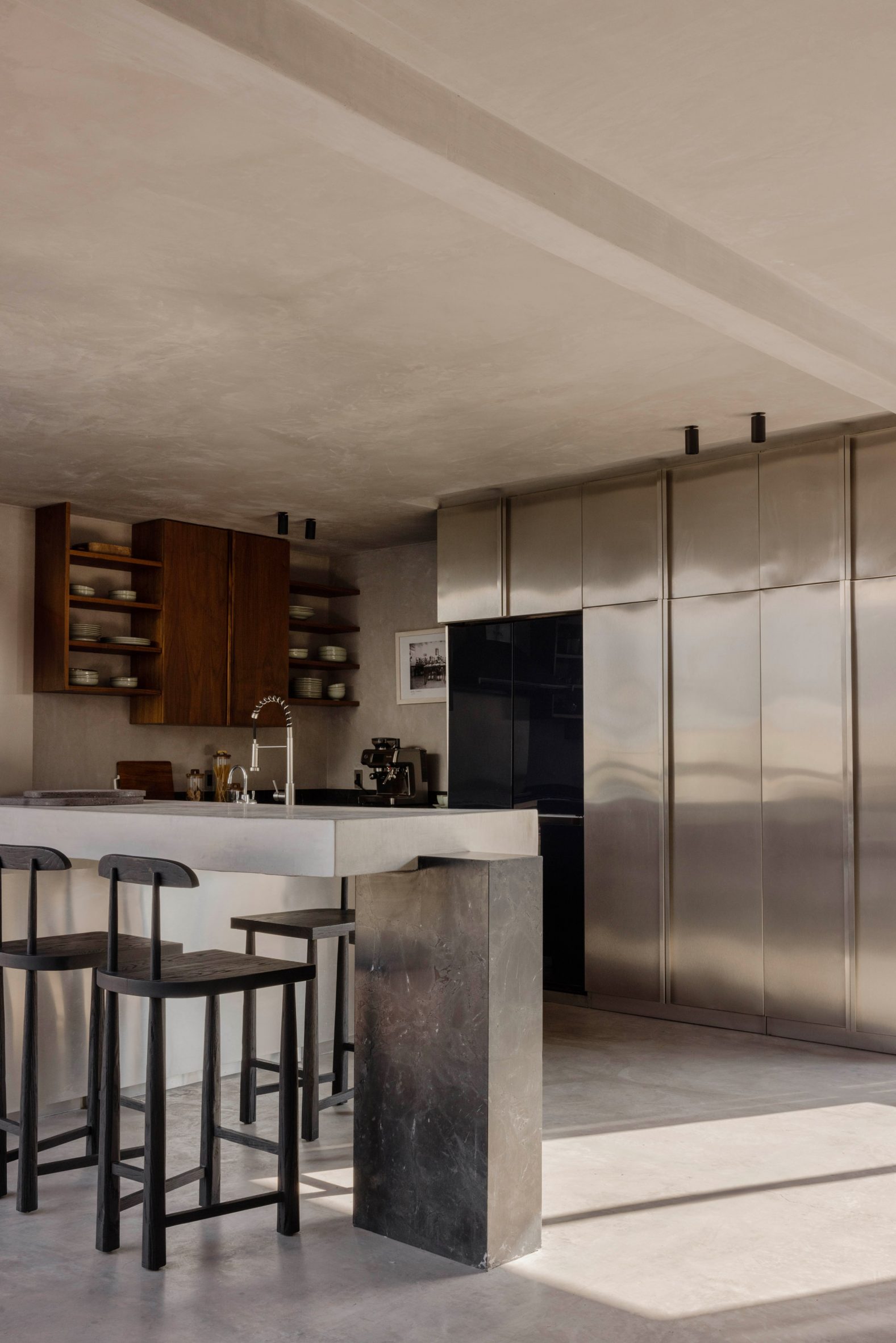 Dans ces espaces, le sol en béton et les surfaces en stuc texturé forment un socle sur lequel se superposent des dalles de pierre, des menuiseries en noyer et des éléments réfléchissants. La maison traduit le concept de brutalisme chaleureux en un espace de vie introspectif et sculptural, défini par la matérialité, la lumière et l’atmosphère.