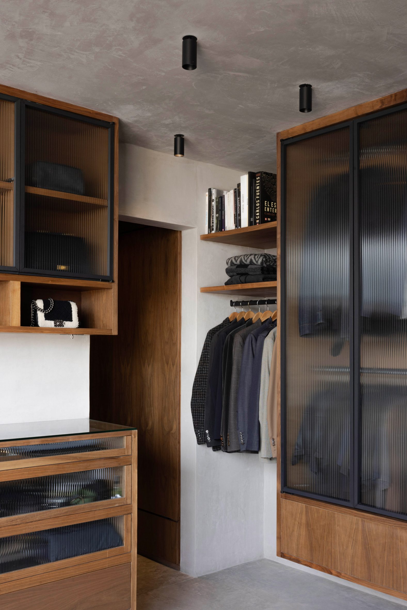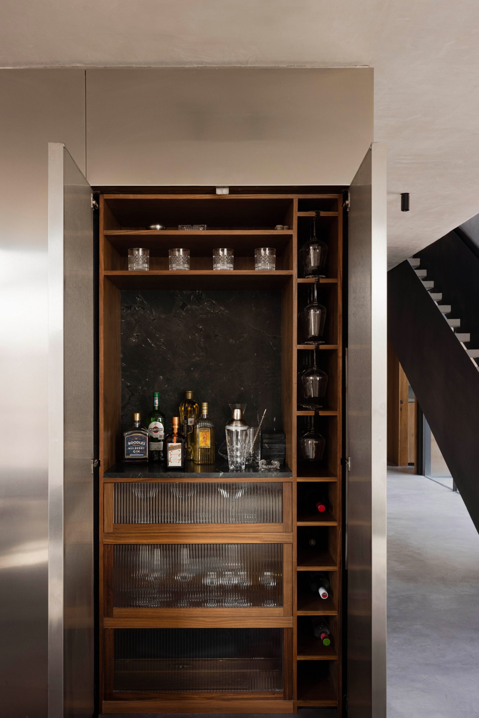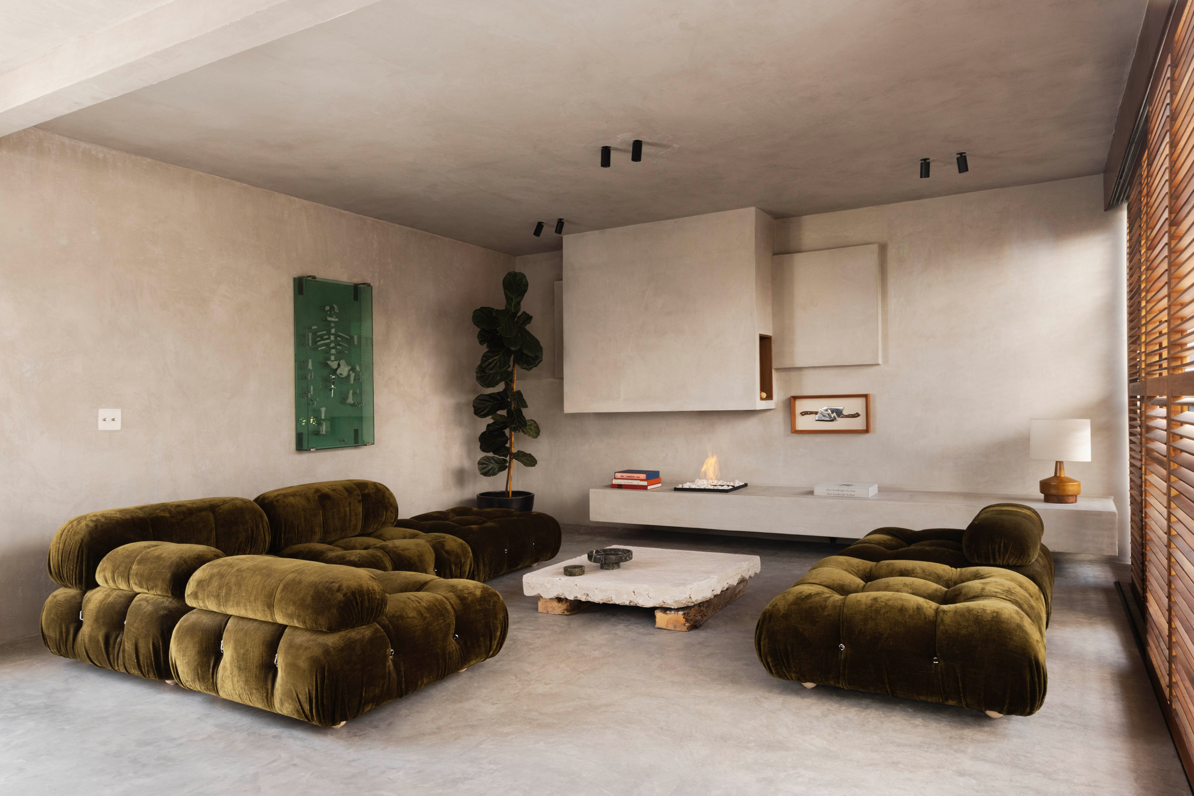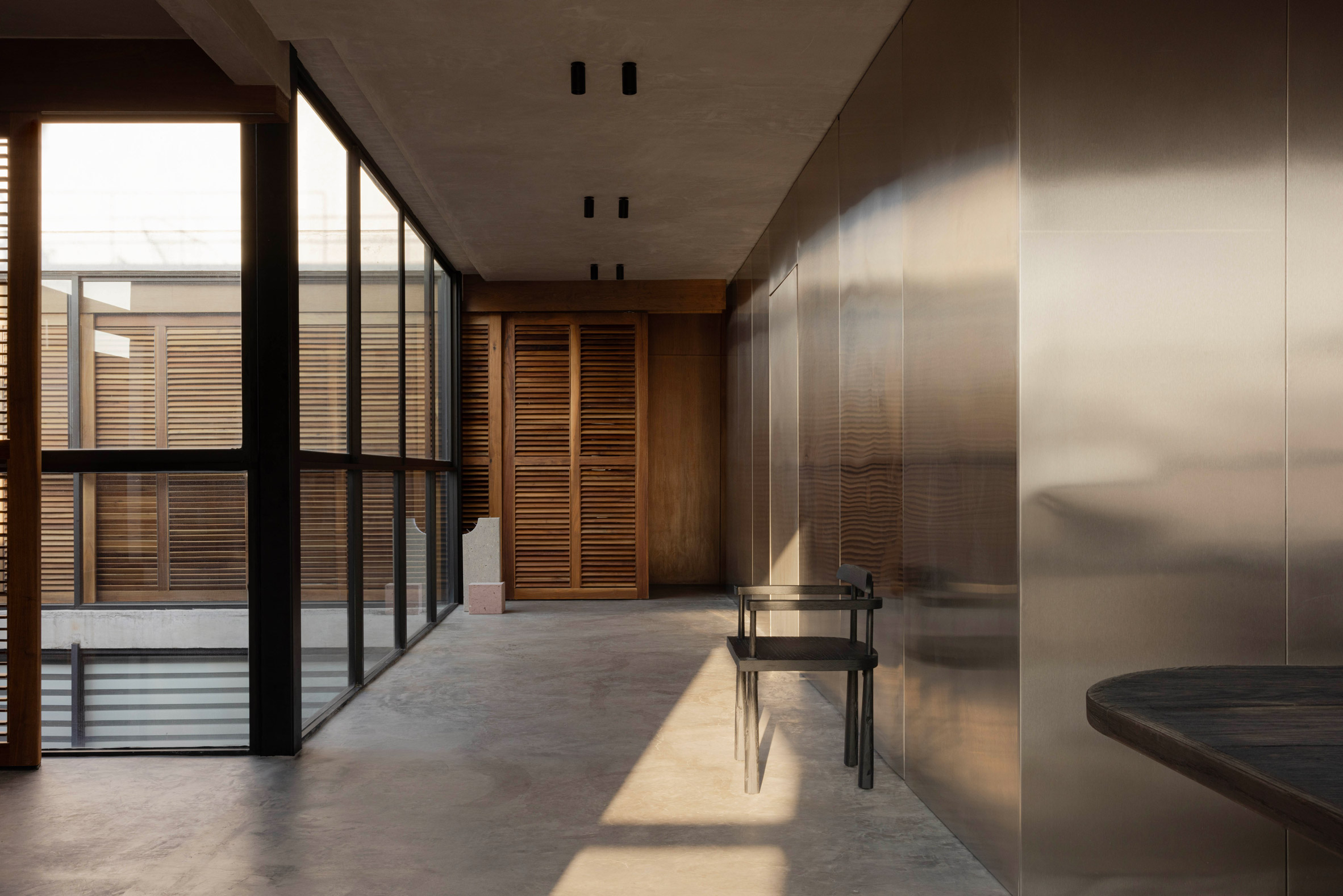 Dans ces espaces, le sol en béton et les surfaces en stuc texturé forment un socle sur lequel se superposent des dalles de pierre, des menuiseries en noyer et des éléments réfléchissants. La maison traduit le concept de brutalisme chaleureux en un espace de vie introspectif et sculptural, défini par la matérialité, la lumière et l’atmosphère.