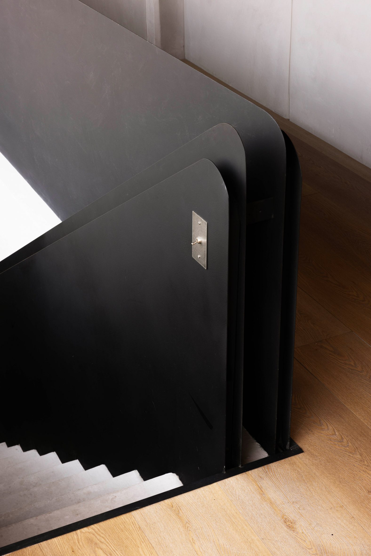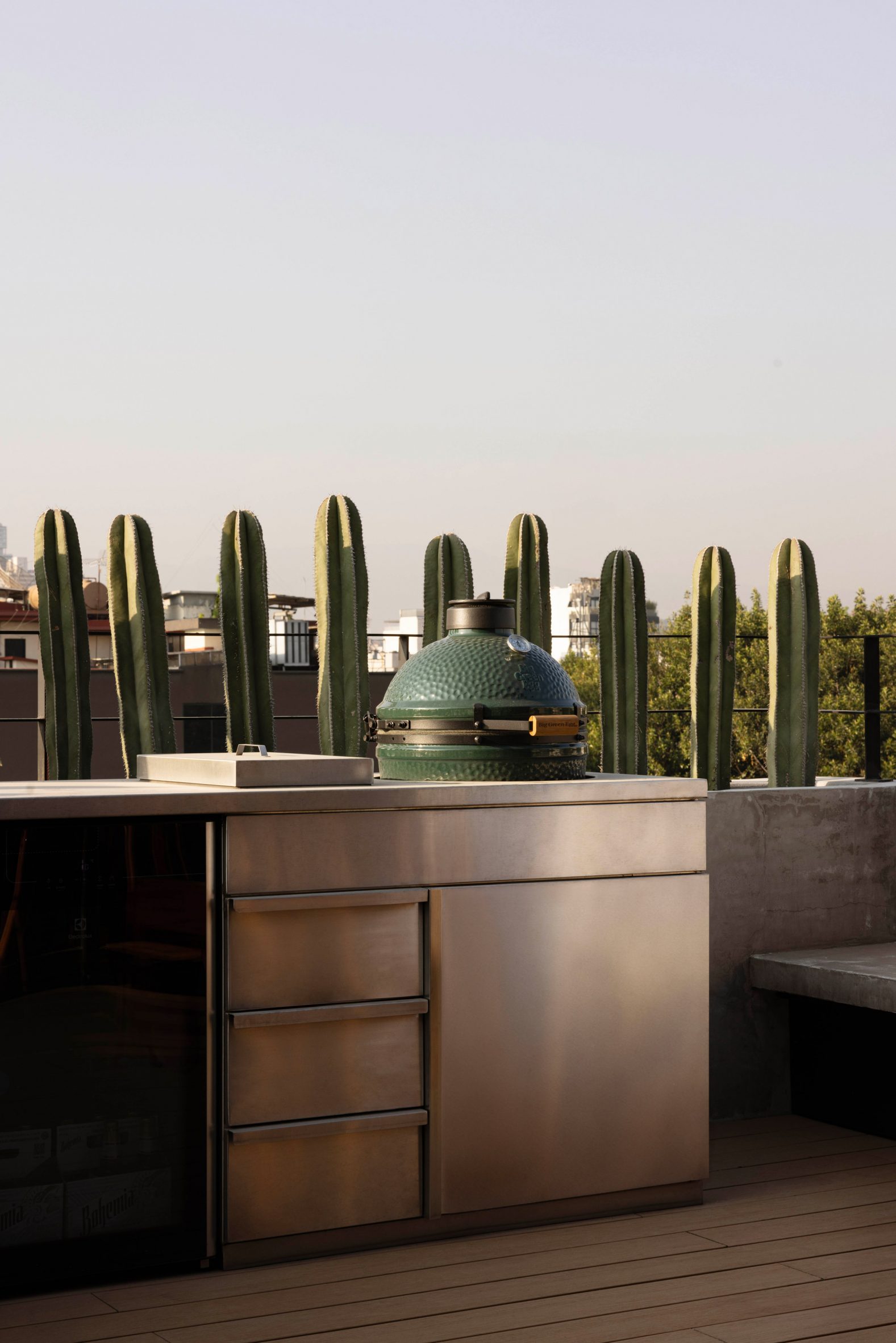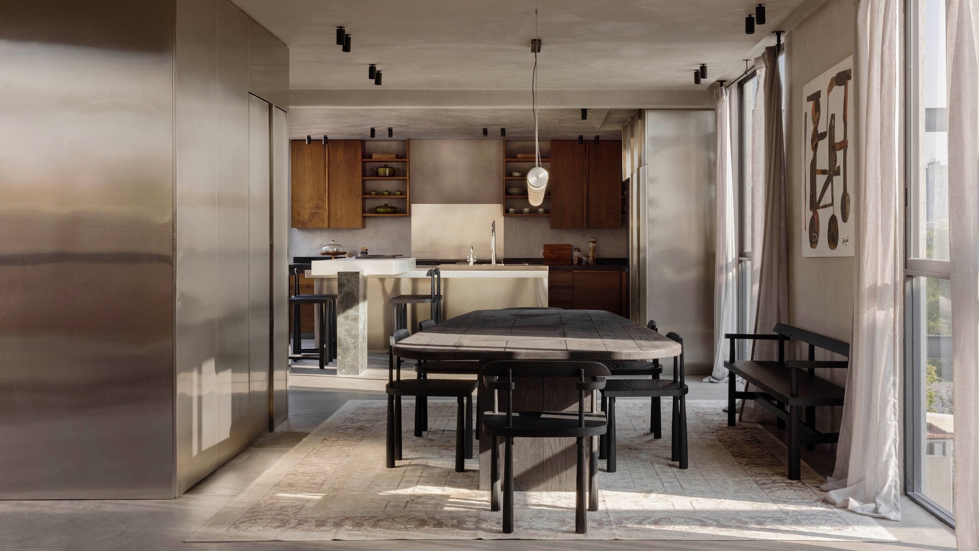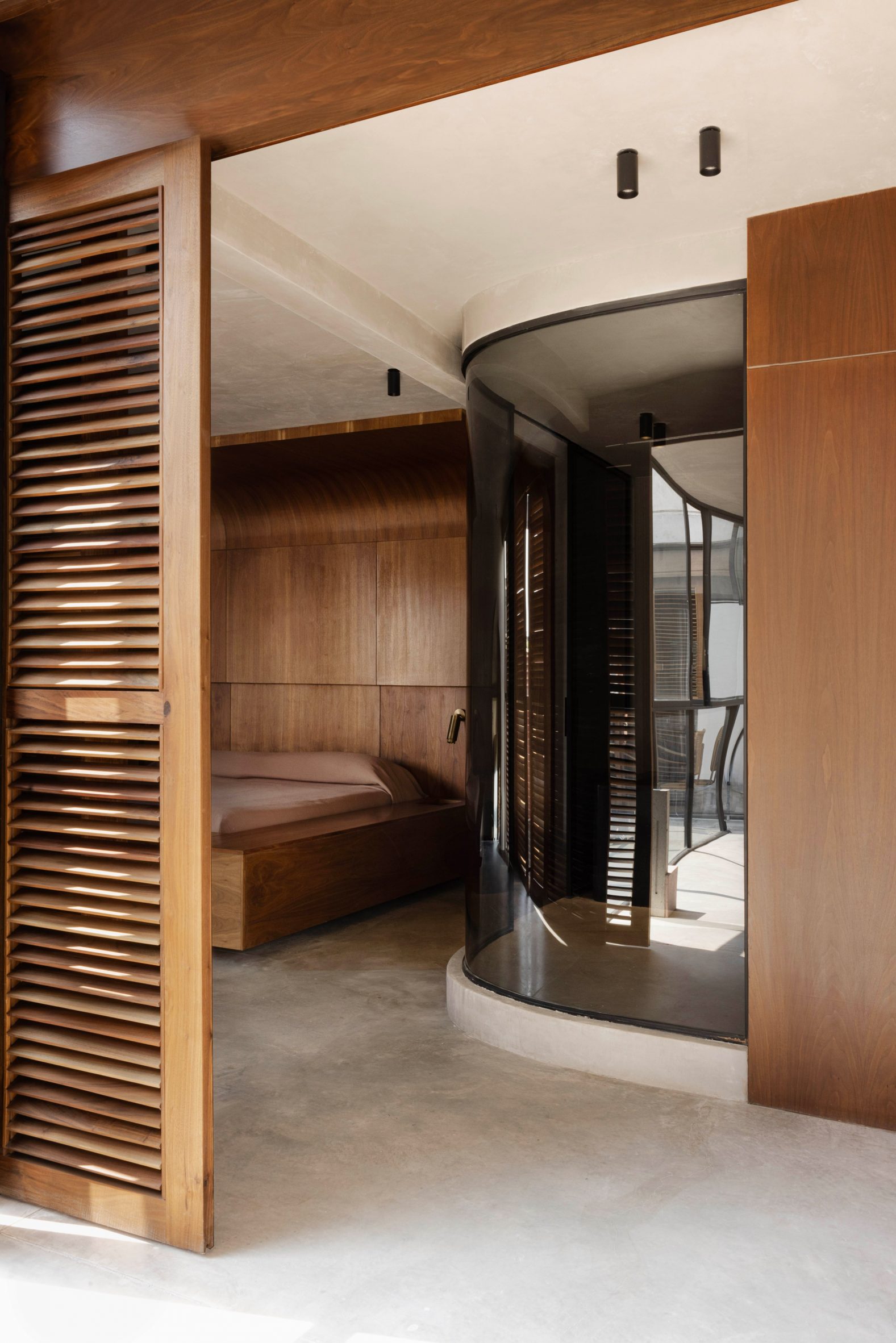 Les persiennes en bois et les volumes courbes instaurent une sensation de sérénité au cœur de la ville. Des tabourets de bar et des meubles de salle à manger en bois teinté noir apportent une présence visuelle aux intérieurs neutres, tout comme les comptoirs en pierre et les balustrades en tôle massive qui encadrent l’escalier menant au toit.