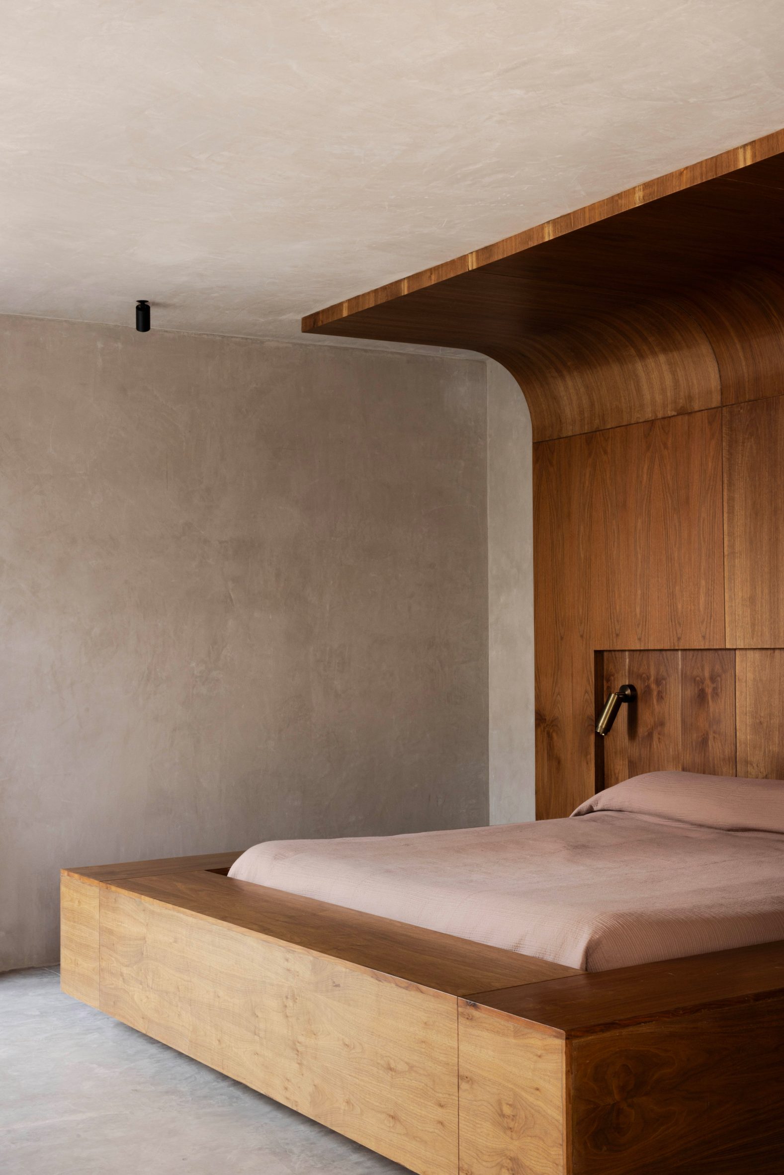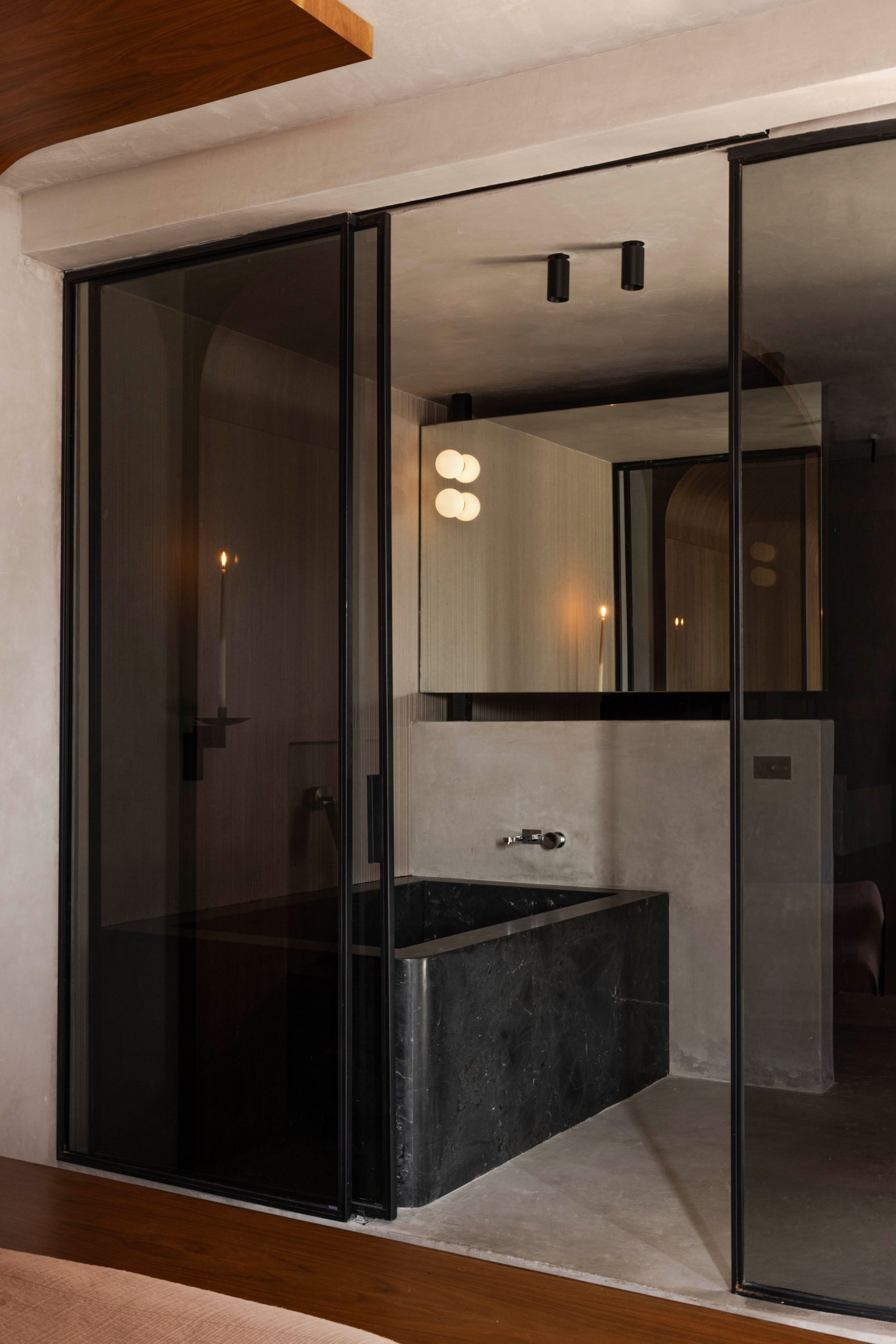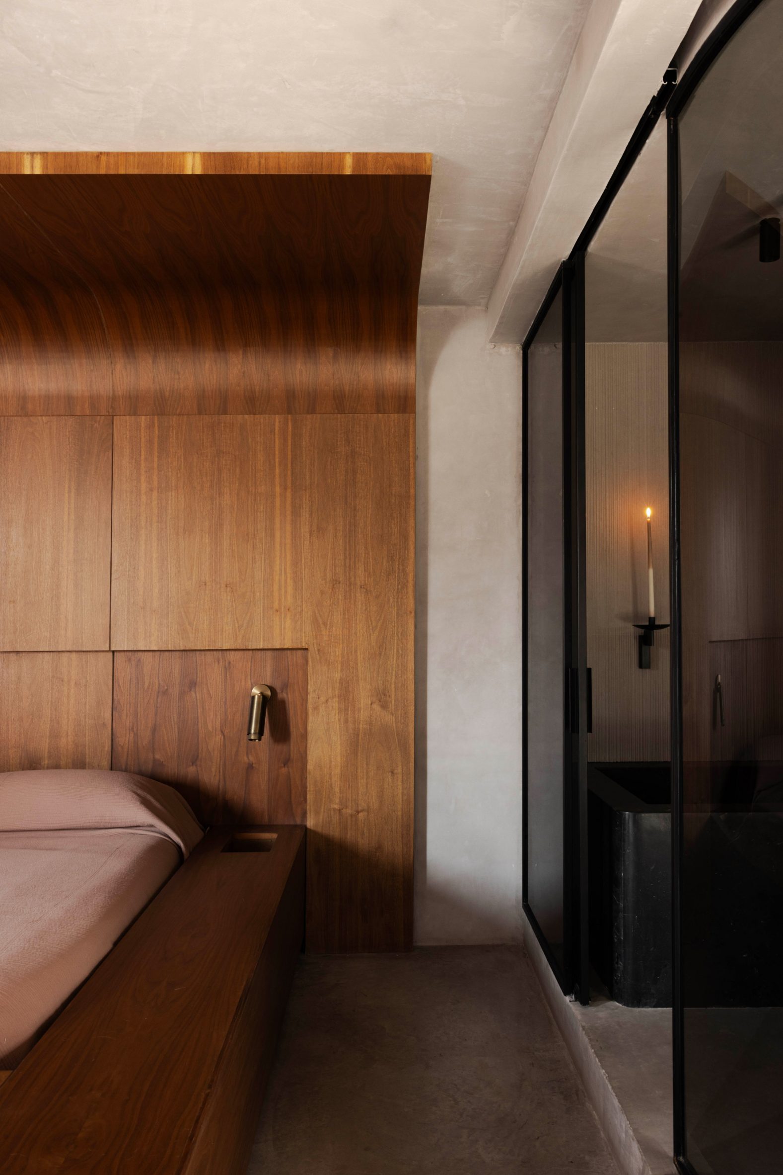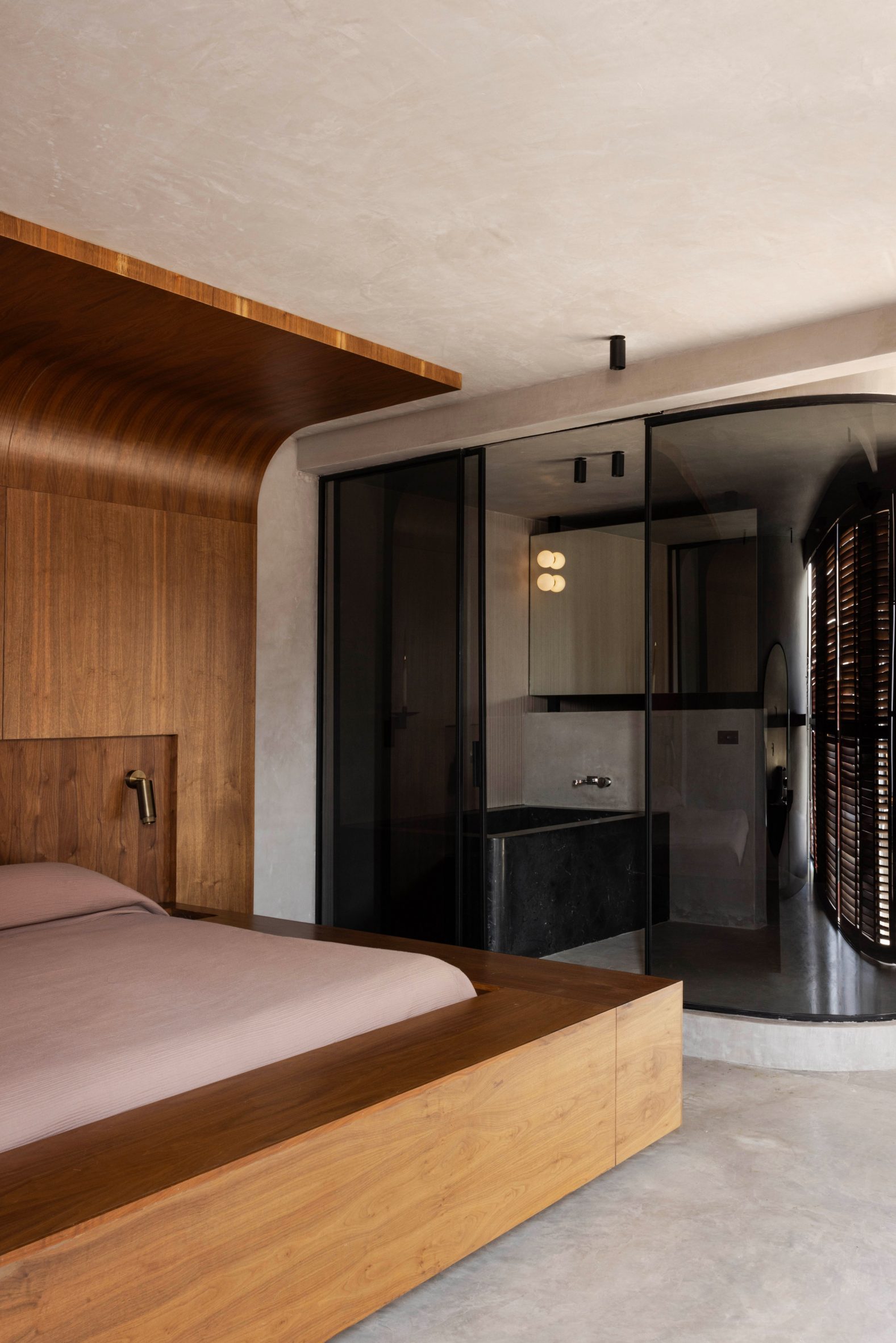 Des parois de verre teinté foncé habillent la salle de bains, qui comprend une baignoire monolithique en pierre, tandis que des persiennes coulissantes en noyer habillent les fenêtres de la chambre pour plus d’intimité. Les lignes architecturales audacieuses et monolithiques sont adoucies par des angles arrondis, des menuiseries en noyer chaleureux et des éléments sculpturaux en pierre.