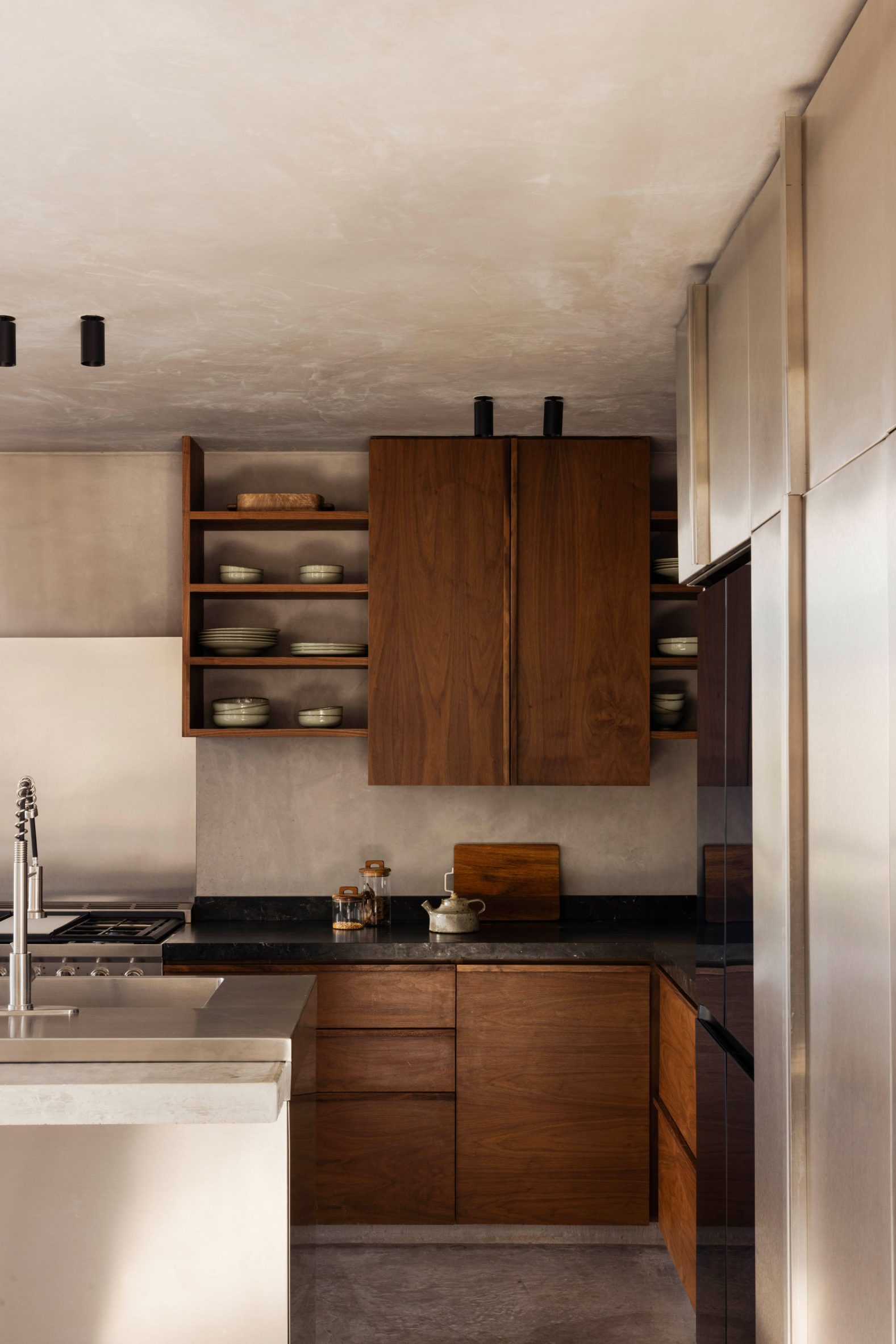 Le studio de design hollandais Barde vanVoltt a utilisé des murs en stuc texturé, des panneaux en acier inoxydable et des éléments sculpturaux en pierre pour aménager de duplex à Mexico.
