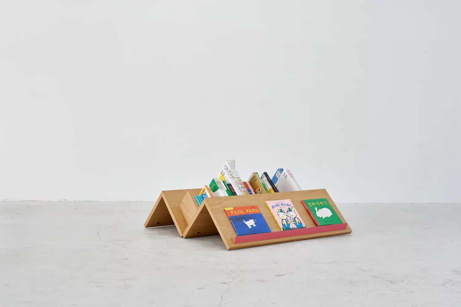Les serre-livres dessinés pour le projet ont eux-mêmes une silhouette d’ouvrage refermé. Des butées triangulaires colorées maintiennent les albums sur les versants, les teintes jouent avec les couvertures. Un clin d’œil qui évite à l’objet toute rigueur démonstrative. L’esprit reste proche d’autres mobiliers pensés pour le jeune public, comme Forteresse, le bureau pour enfant du collectif At Once, où la matière douce et la finition ajustable priment sur le discours.