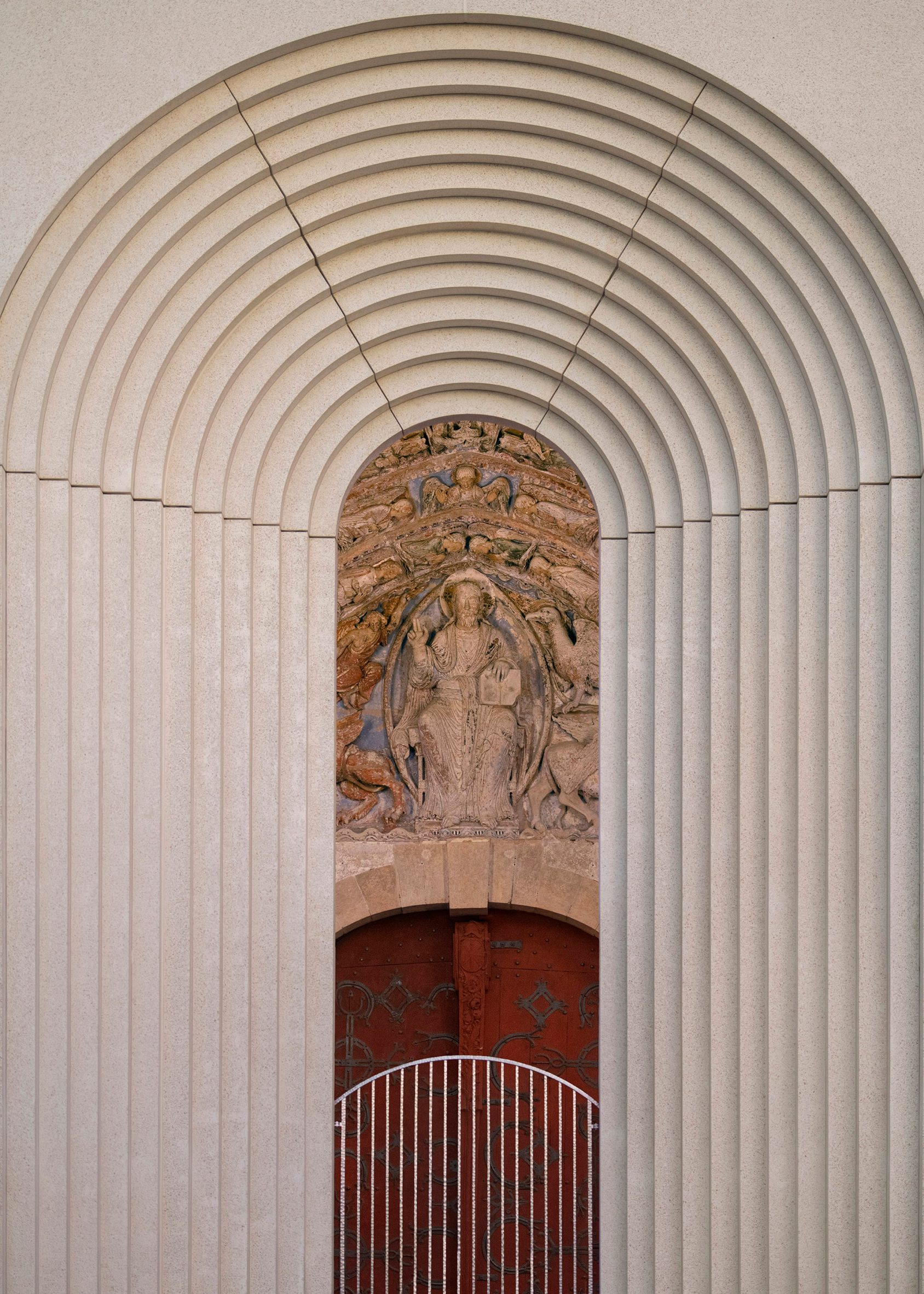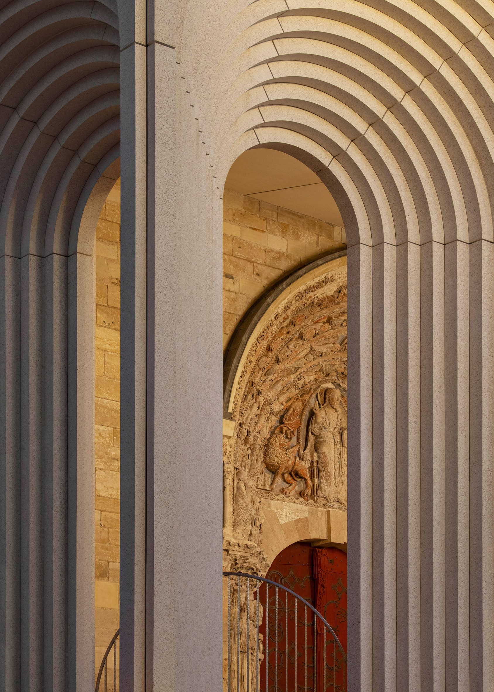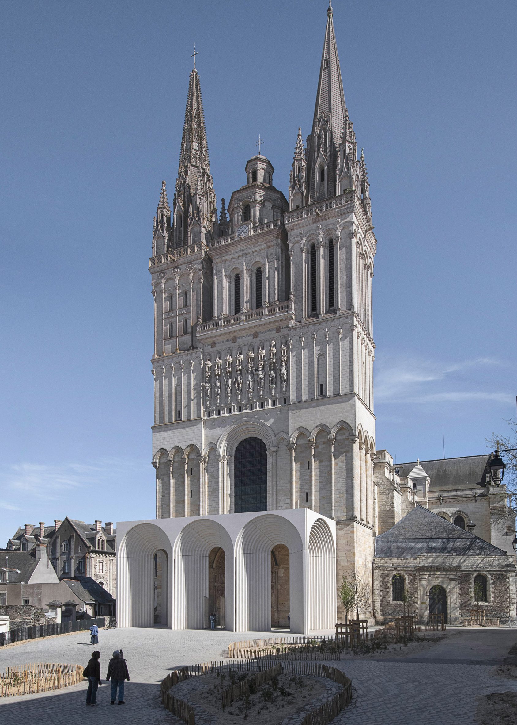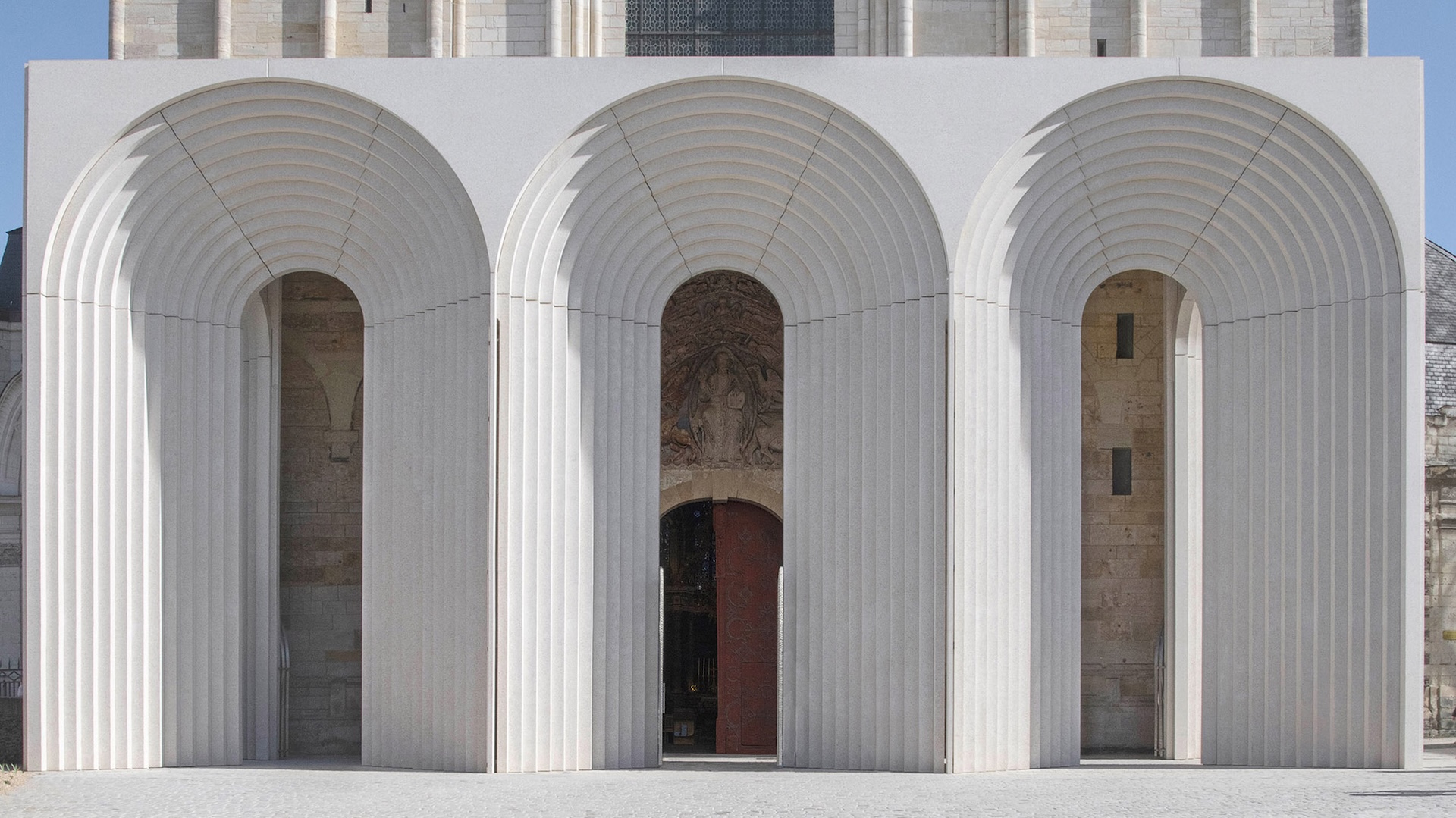 Inaugurée en début de mois, cette entrée en béton fait office de galerie, encadrant et protégeant les polychromies du portail sculptural situé à l’ouest de la cathédrale de style gothique angevin. Sa forme rectangulaire est interrompue par cinq arcades. À l’extérieur, les arcades sont cernées d’archivoltes, une série de bandes ornementales.