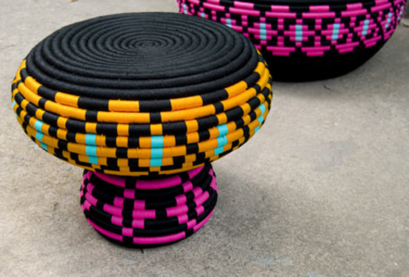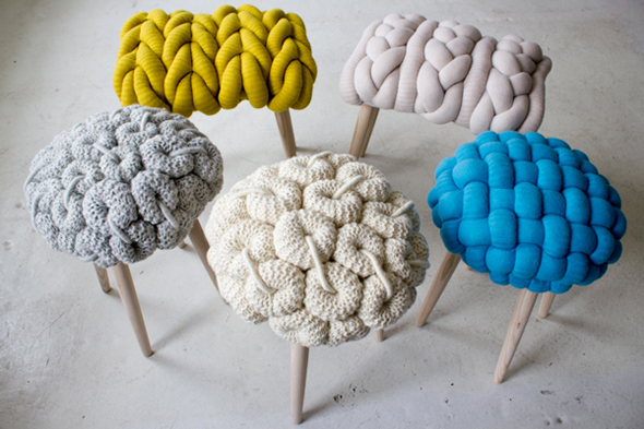 La collection de tabourets Knit Stools a été conçue par Claire-Anne O’Brien. Chaque tabouret a une assise particulière de forme audacieuse et texturée inspirée de la maille tricotée.