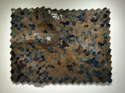 Instagram de amineasselman : The moment light hits the oxide. This piece, made with ceramic tiles and an intense application of mineral oxides, lives in duality. In the shadow, the surface holds...