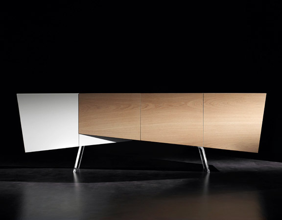 Encore un mariage de matière extrêmement bien réussi. La forme accentue l’effet du chaud et du froid, du bois et du laqué.